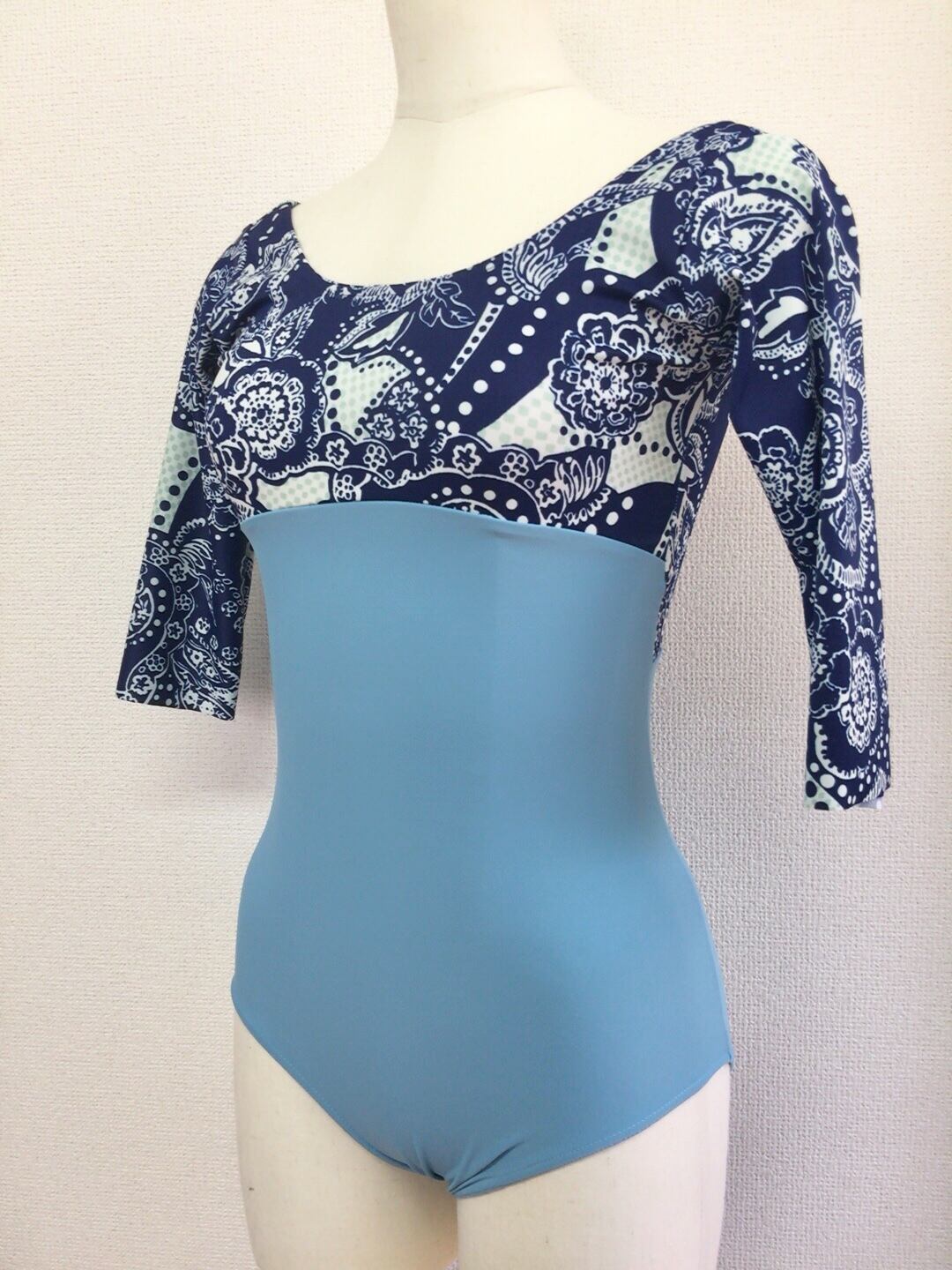 濃い水色のボディー、紺色ベースのお花やドット模様が描かれている5部袖レオタードです。