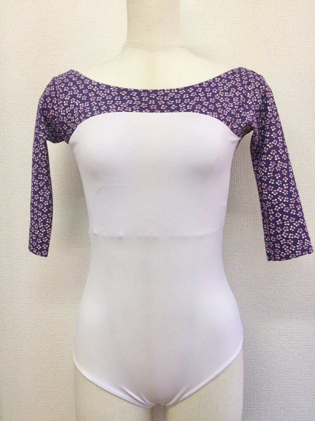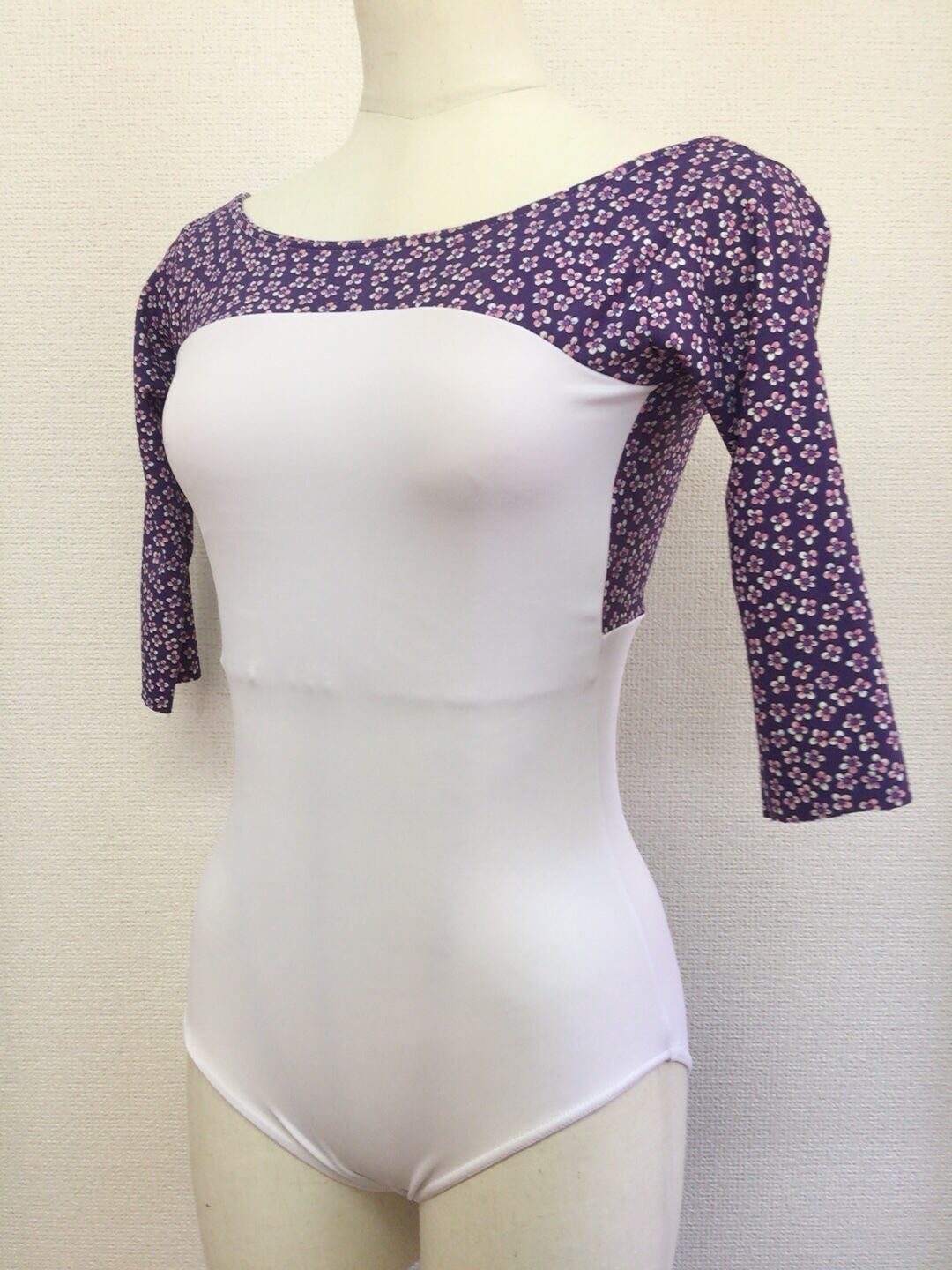 白色のボディー、紫色に白ピンクの小花がたくさん描かれた5部袖レオタードです。