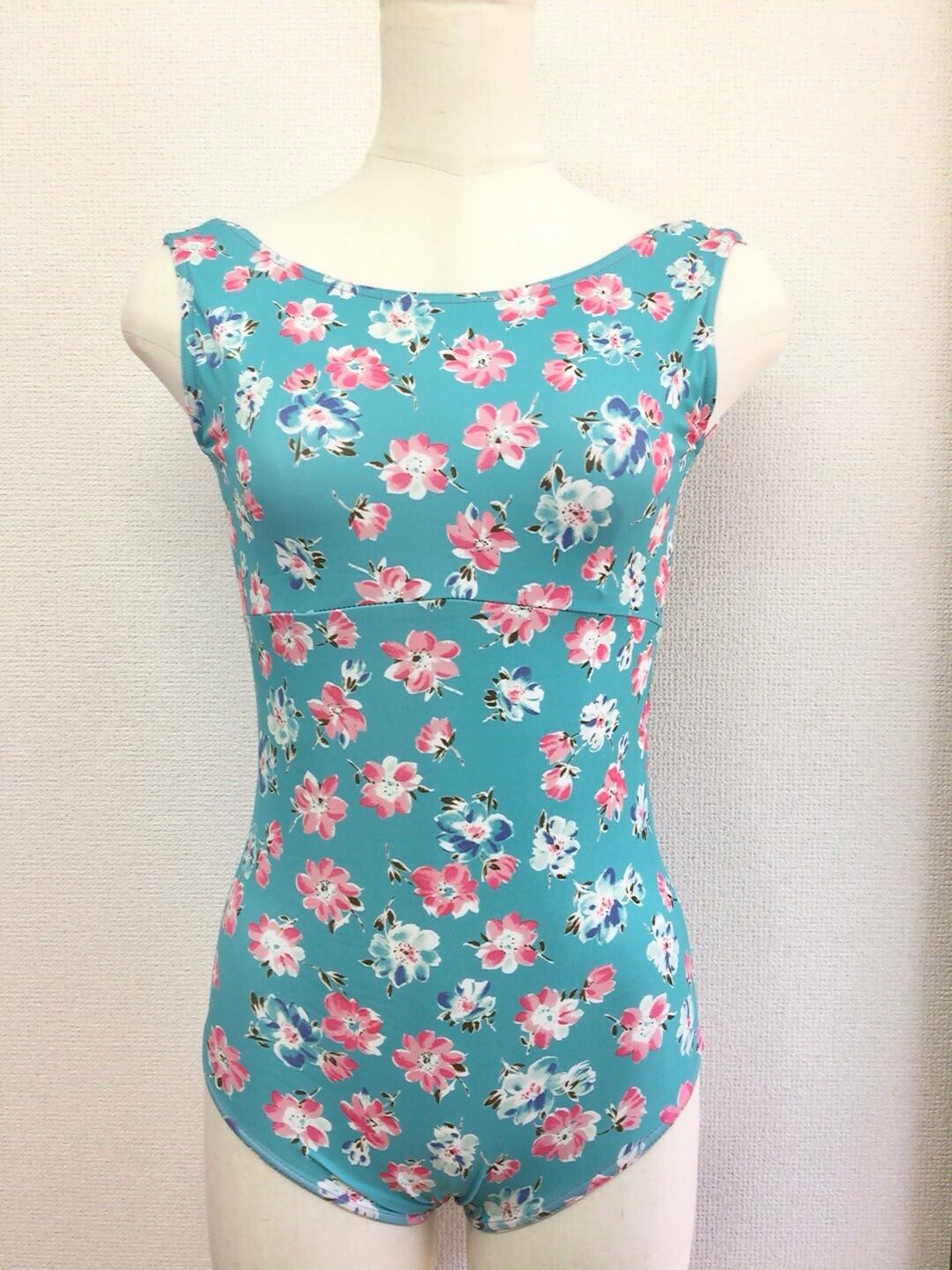 少しブルー混じりの緑色ベースに2色のお花が描かれた総柄のタンクトップレオタードです。