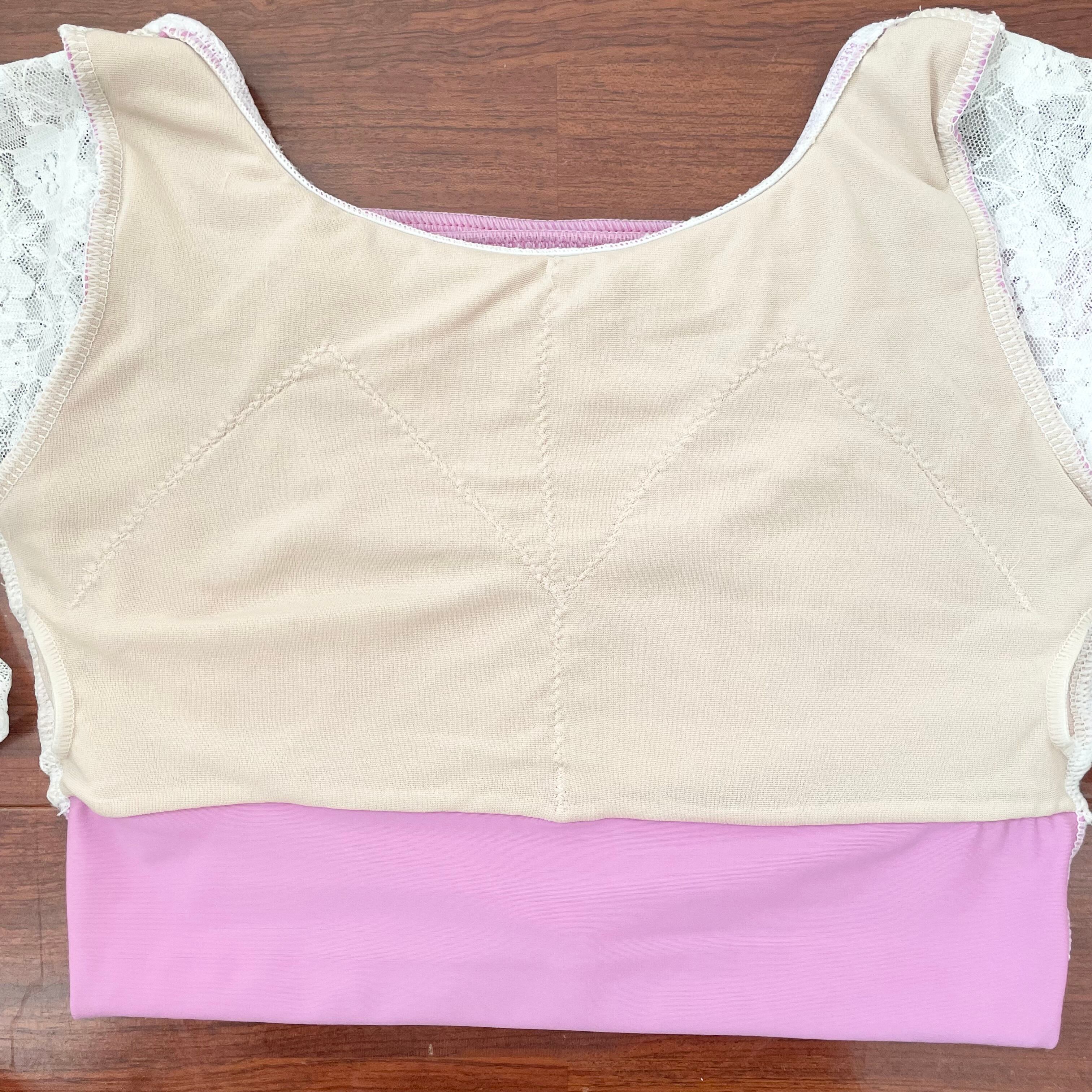 レオタードの様に下から着用し、アンダーバストにラインを合わせて袖を通してください。