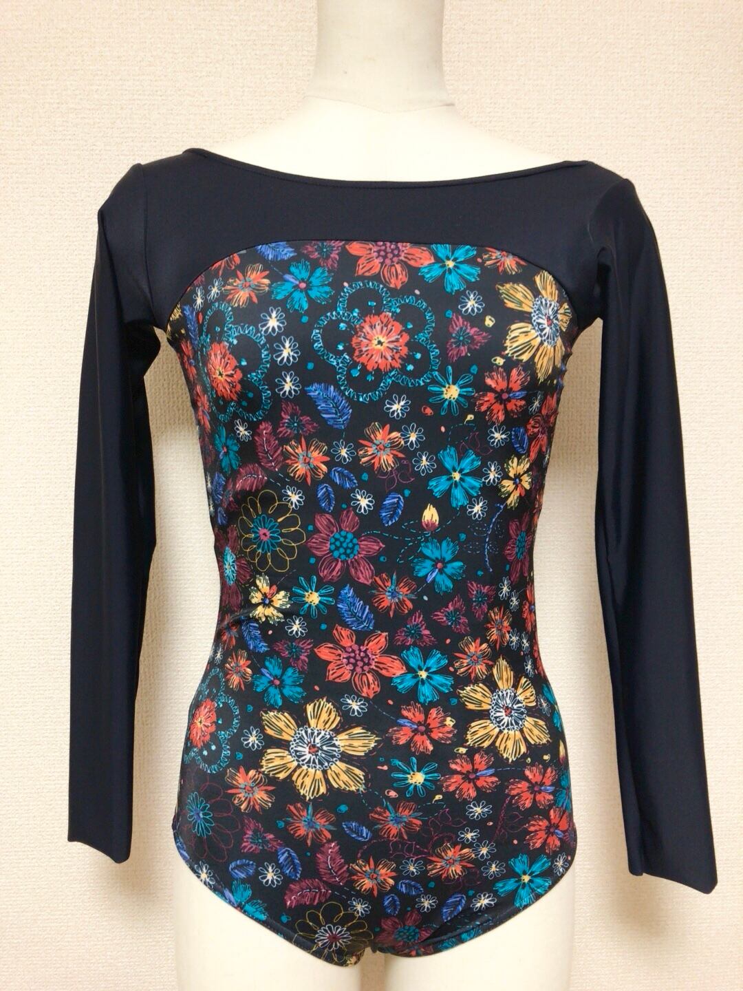 黒色のボディーに黒地に花柄などのカラフルな模様が描かれている生地を合わせた長袖レオタードです。