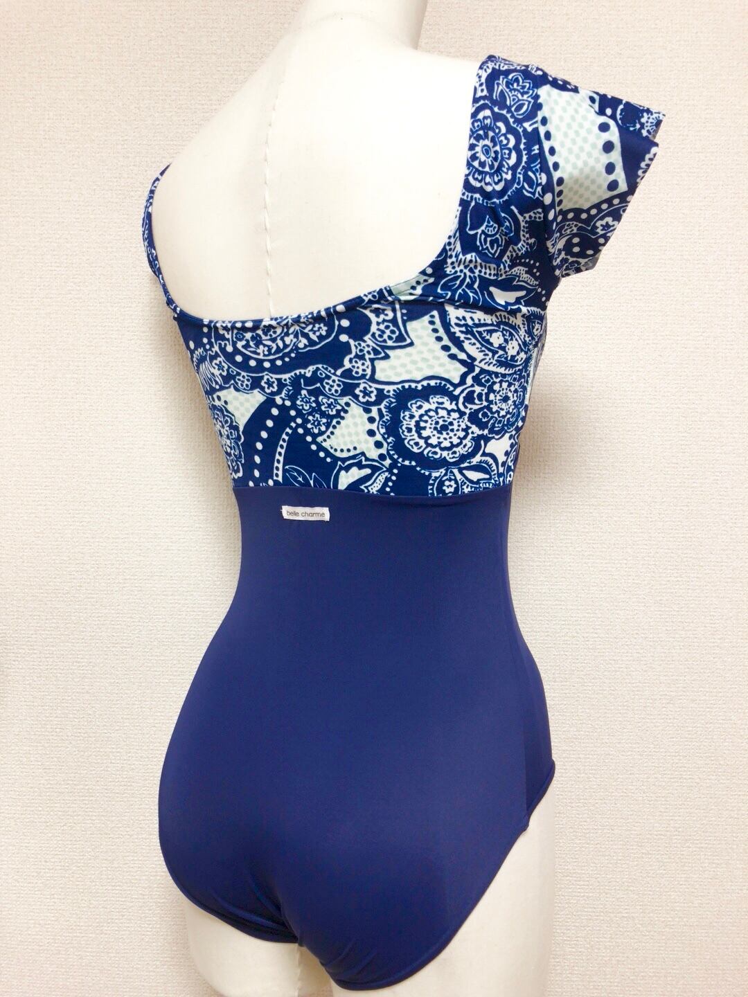 紺色のボディーに紺色地にお花などの模様が描かれた半袖レオタードです。