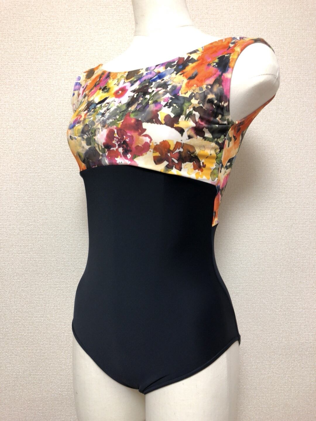 黒地のボディーにカラフルな色の模様の生地を合わせたタンクトップレオタードです。