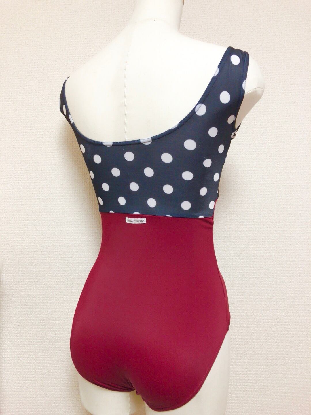 エンジ色のボディーに黒に白色のドット模様の生地を合わせたノースリーブレオタードです。