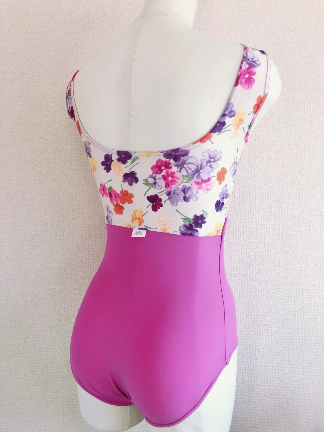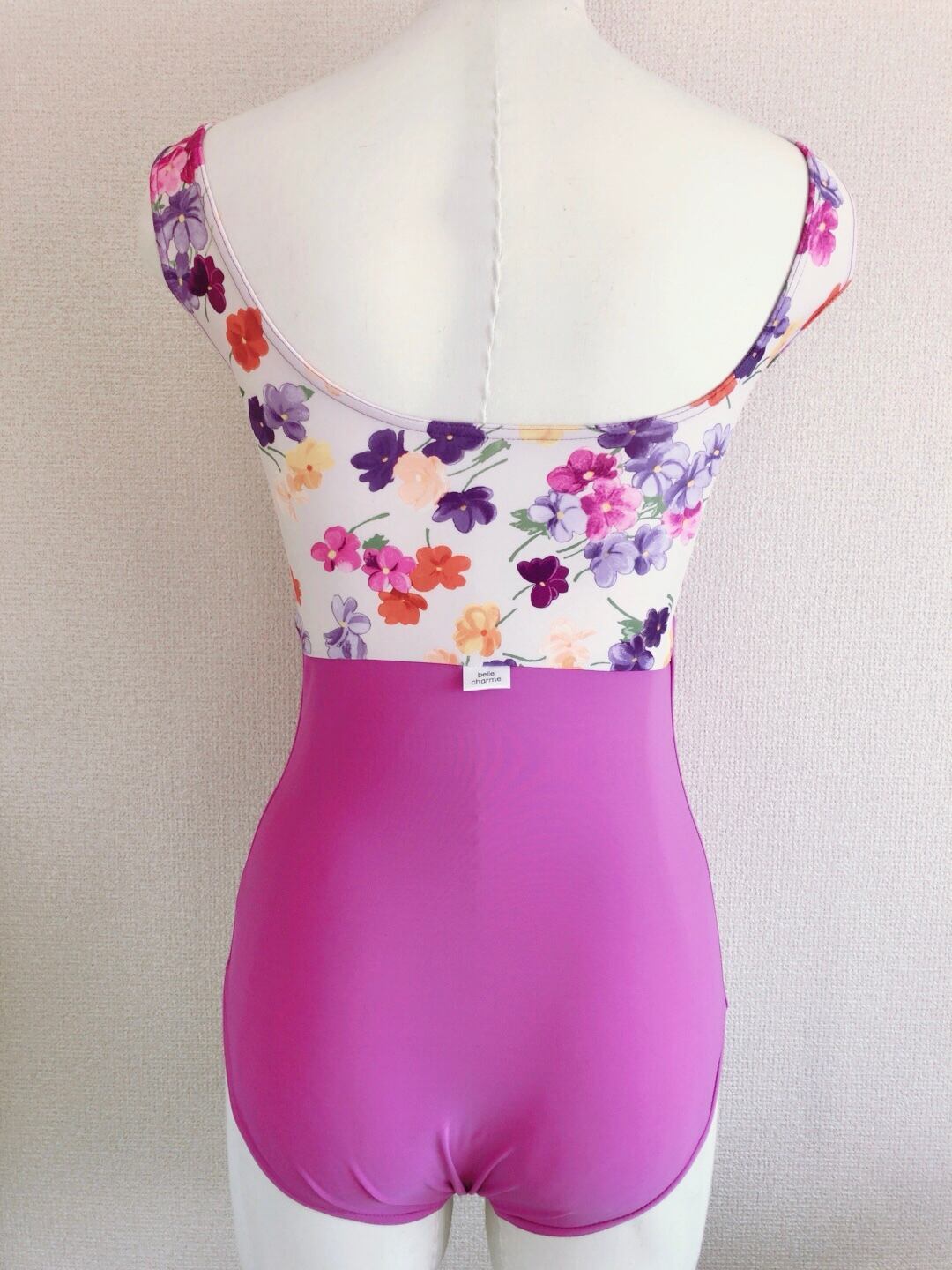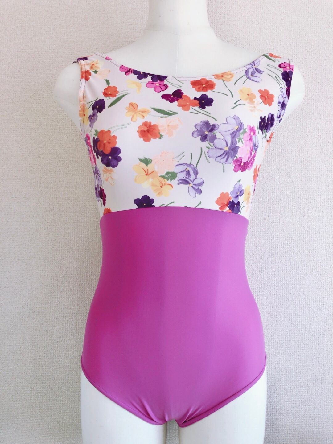 白地にカラフルなお花のプリントされたトップに少しくすんだピンク色のボディーのタンクトップレオタードです。