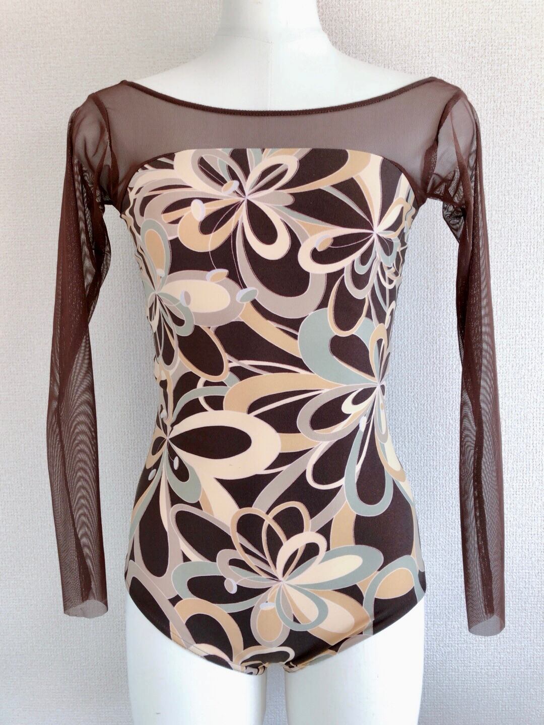 お花模様のボディーに茶色のメッシュ生地を合わせた長袖レオタードです。