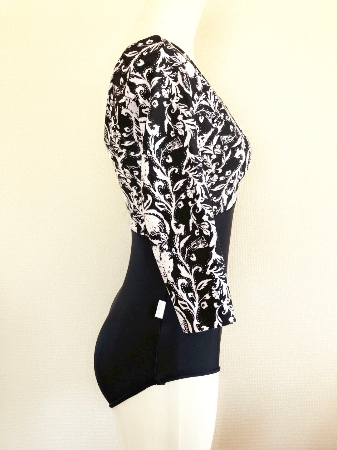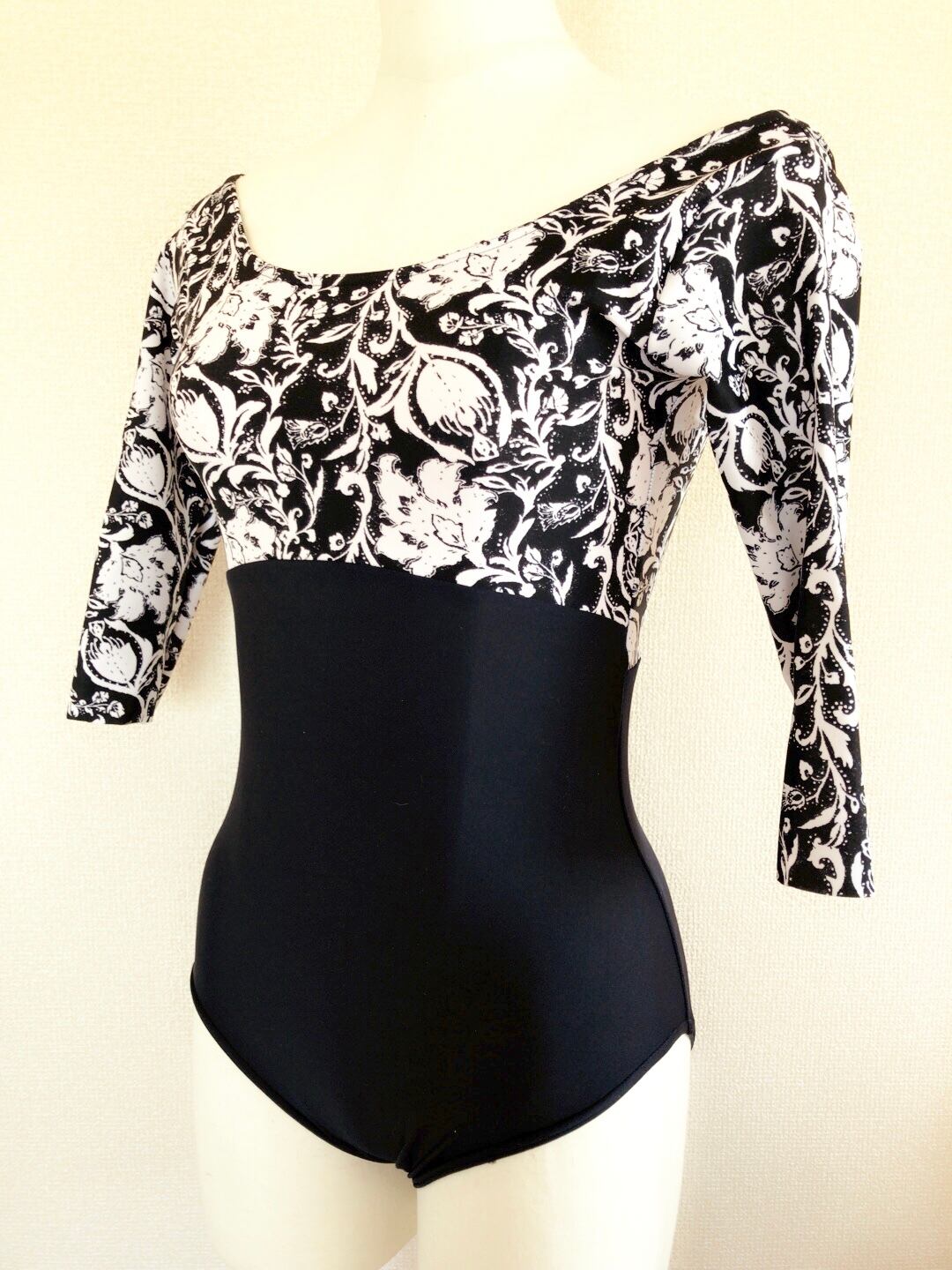 黒色ボディに黒地に白のお花模様の生地を組み合わせた5部袖レオタードです。
