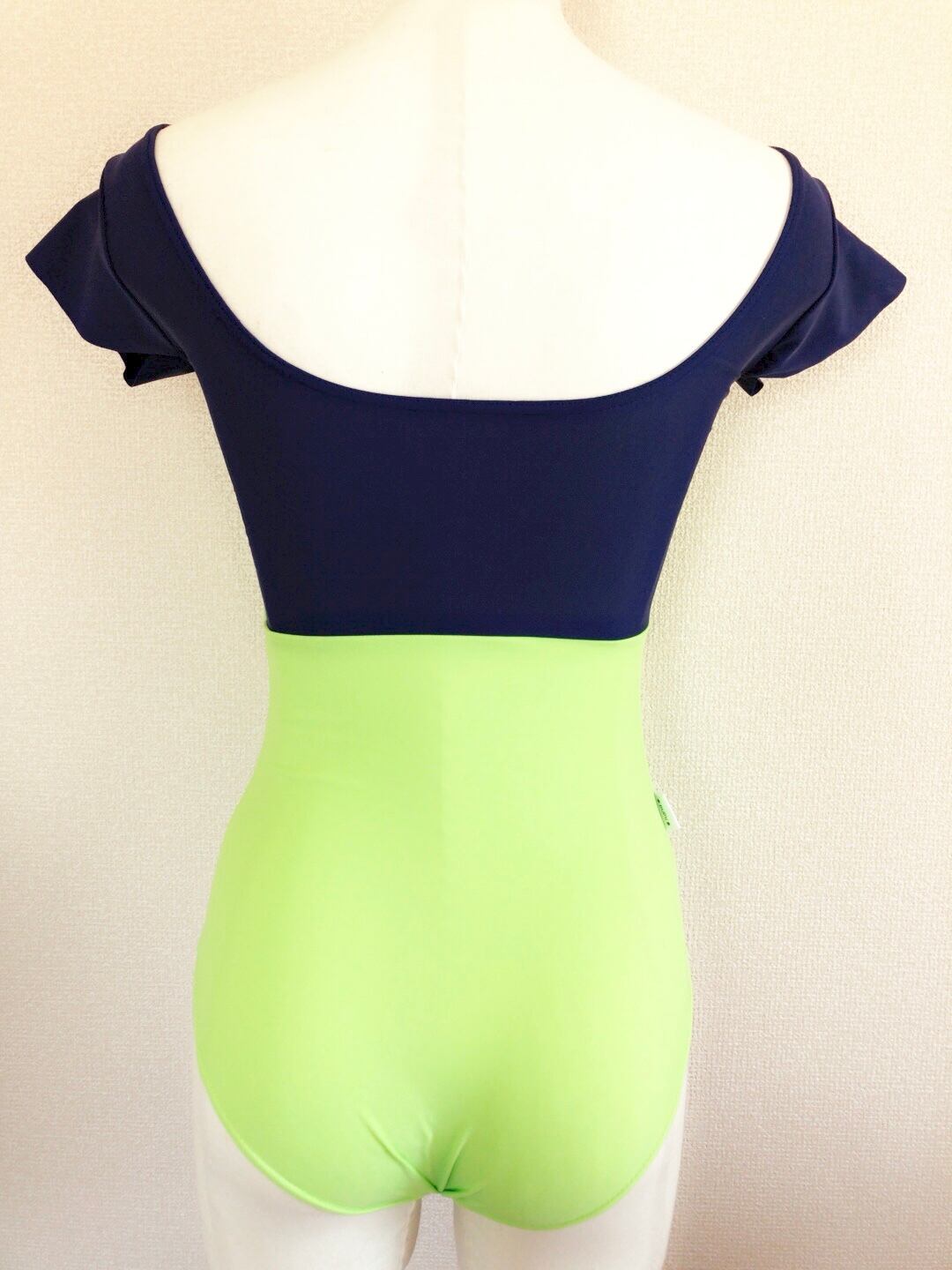 黄緑色のボディに紺色を組み合わせた無地の半袖レオタードです。