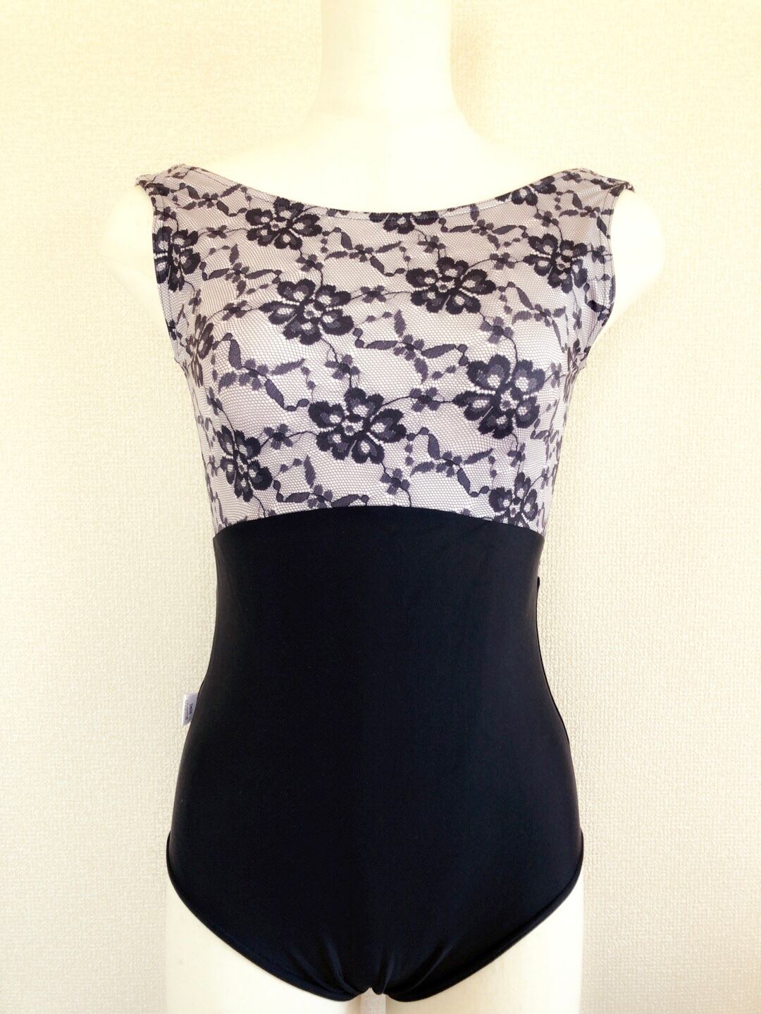 黒色ボディにレース模様の生地を組み合わせたタンクトップレオタードです。