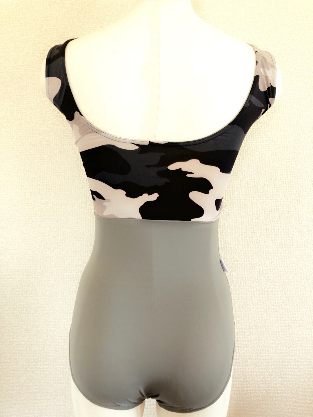 グレーのボディにグレーと黒系の迷彩模様の生地を組み合わせたタンクトップレオタードです。