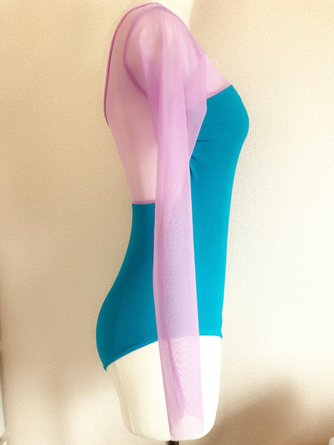 鮮やかなターコイズブルーに紫混じりのピンクメッシュを合わせた長袖レオタードです。