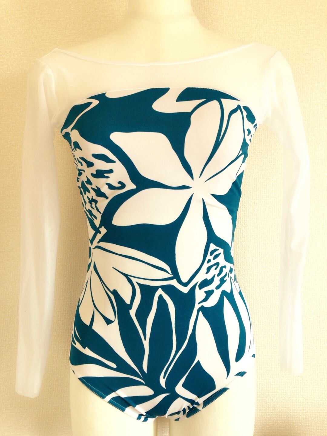 夏らしい大きなお花模様のボディーに白のメッシュ生地を合わせた長袖レオタードです。