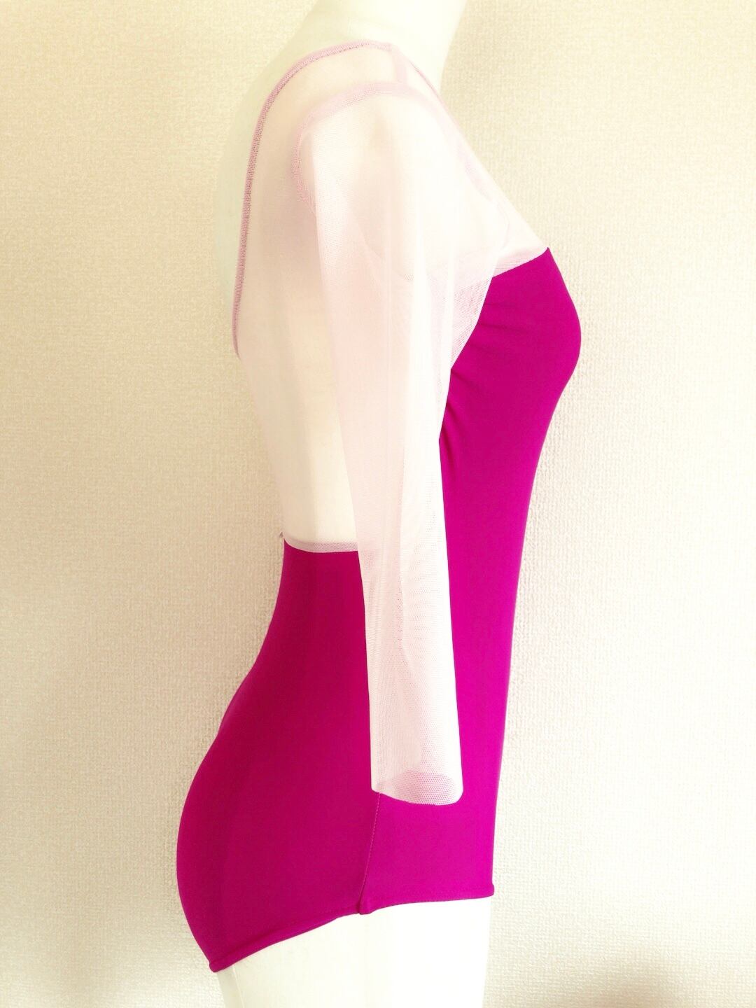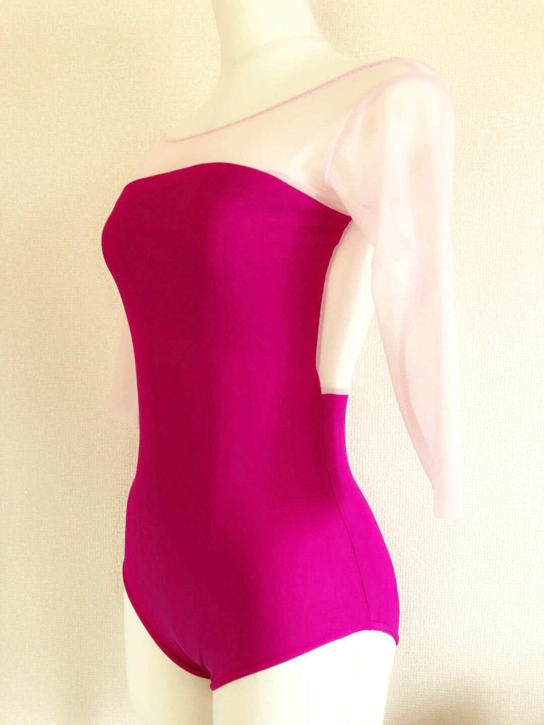 マジェンタピンクのボディーに薄ピンク色のメッシュ生地を合わせた5部袖レオタードです。