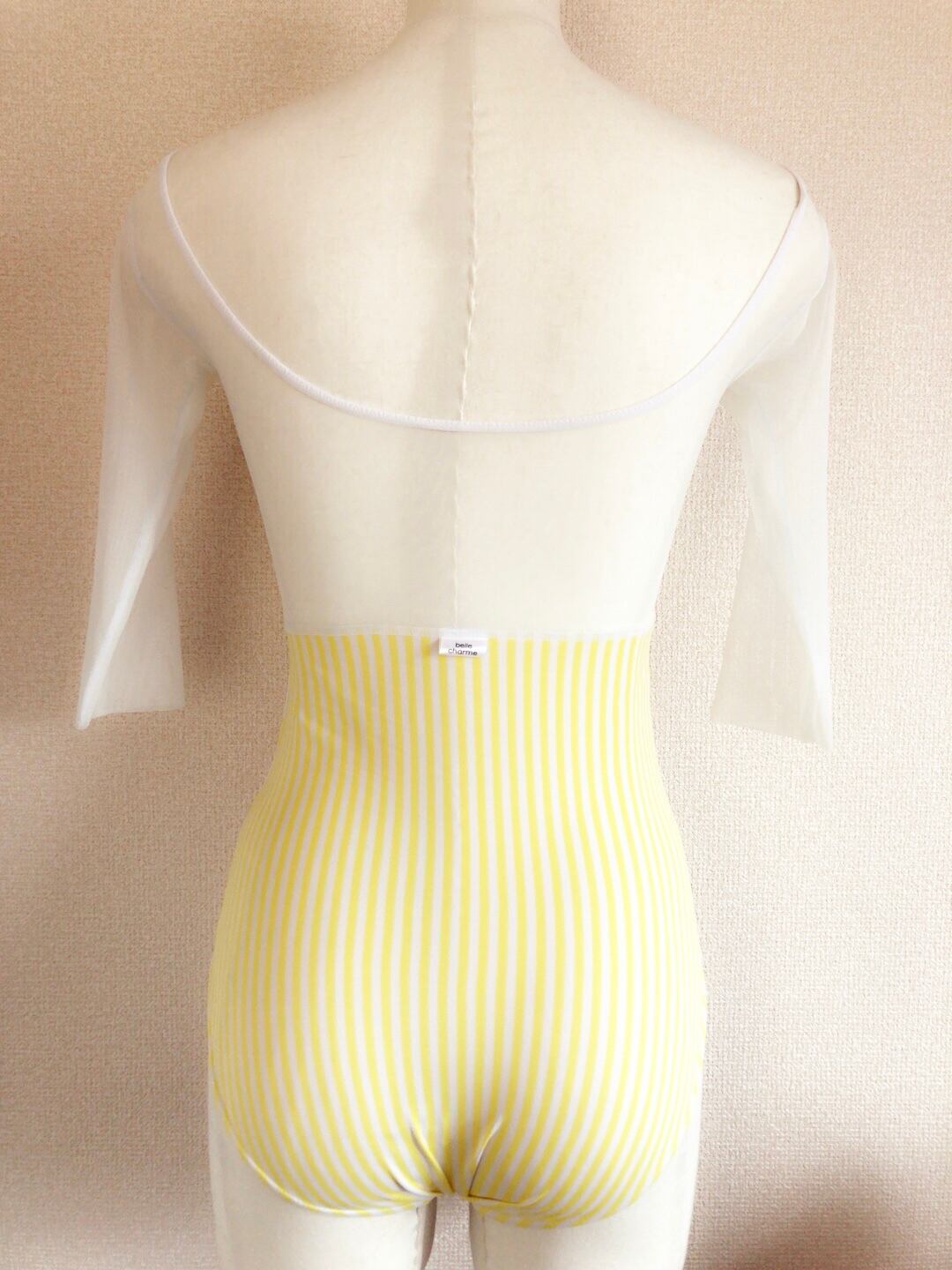 オフホワイトベースに黄色のドットやストライプ模様のボディーにオフホワイトのメッシュ生地を合わせた5部袖レオタードです。