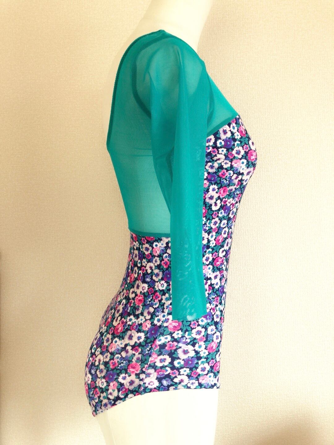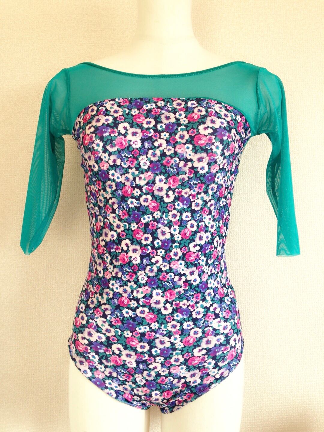 濃い紺色生地に小花がプリントされたボディーに少し淡めの緑色のメッシュ生地を合わせた5部袖レオタードです。