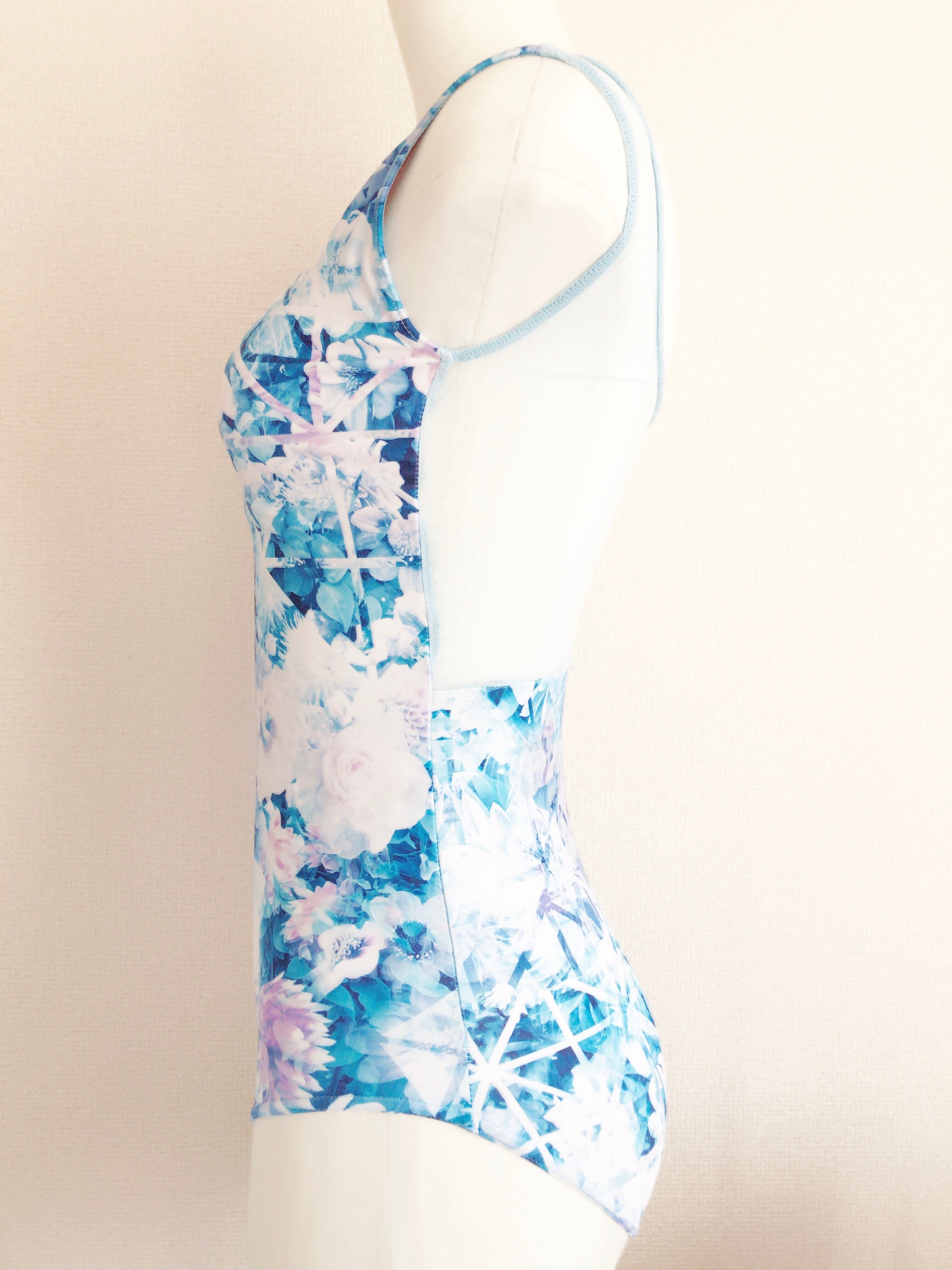 ステンドグラスのような生地の総柄タンクトップレオタードです。