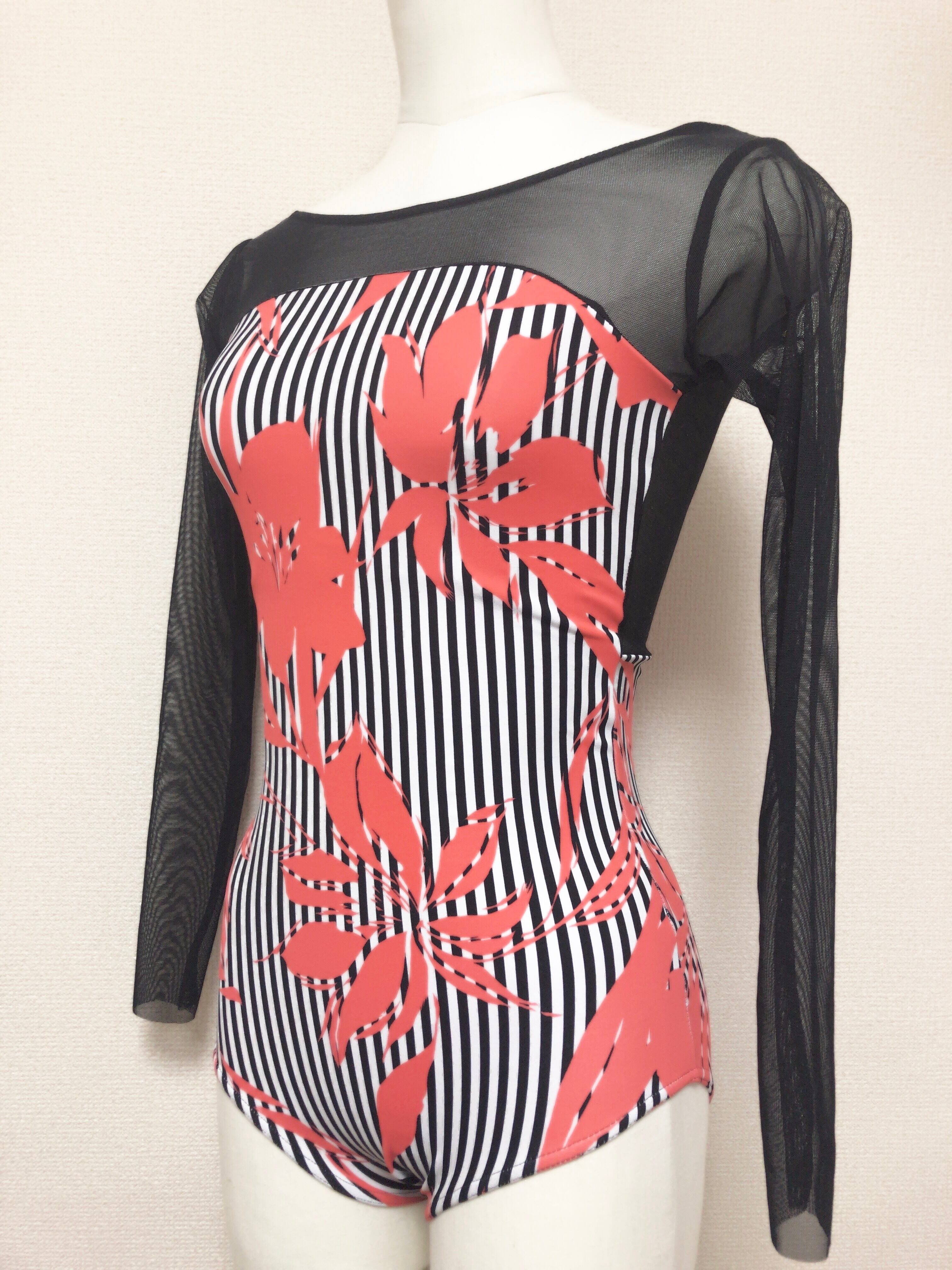 ストライプにオレンジ色のお花が描かれた大人っぽい雰囲気のレオタードです。