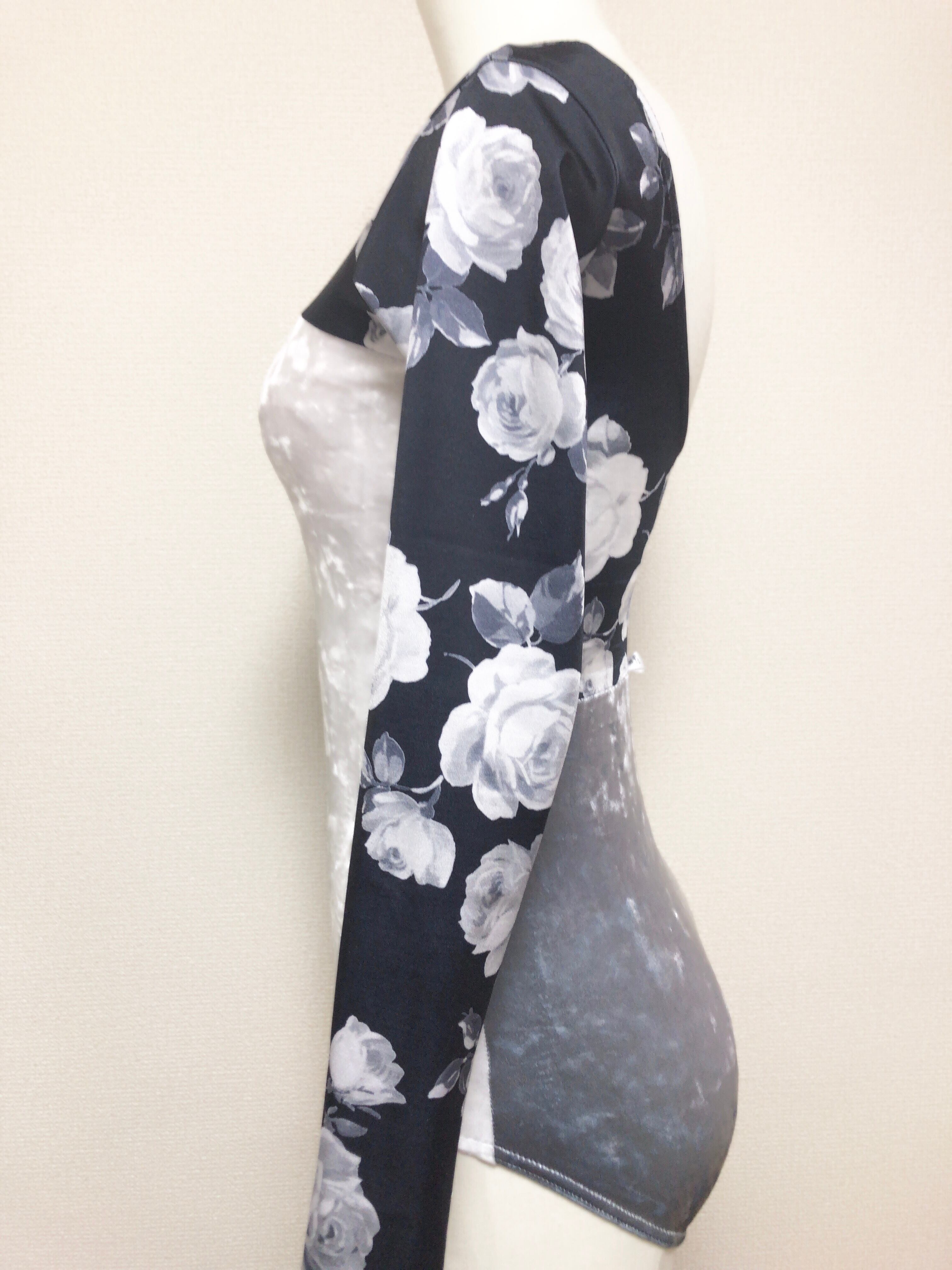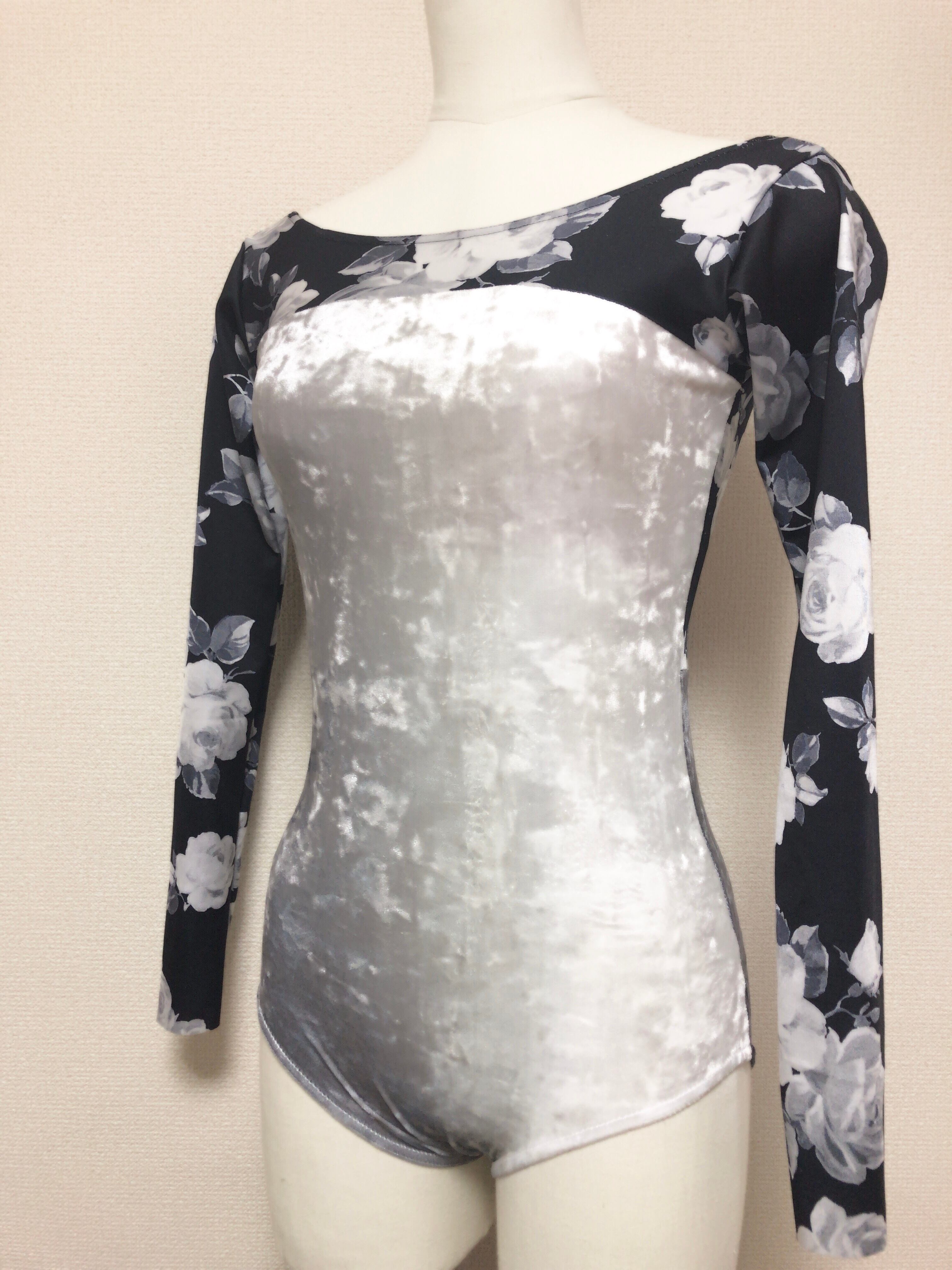 白からグレーに横向きのグラデーションになっているベルベット生地にシルバーのバラ模様の生地を合わせたレオタードです。