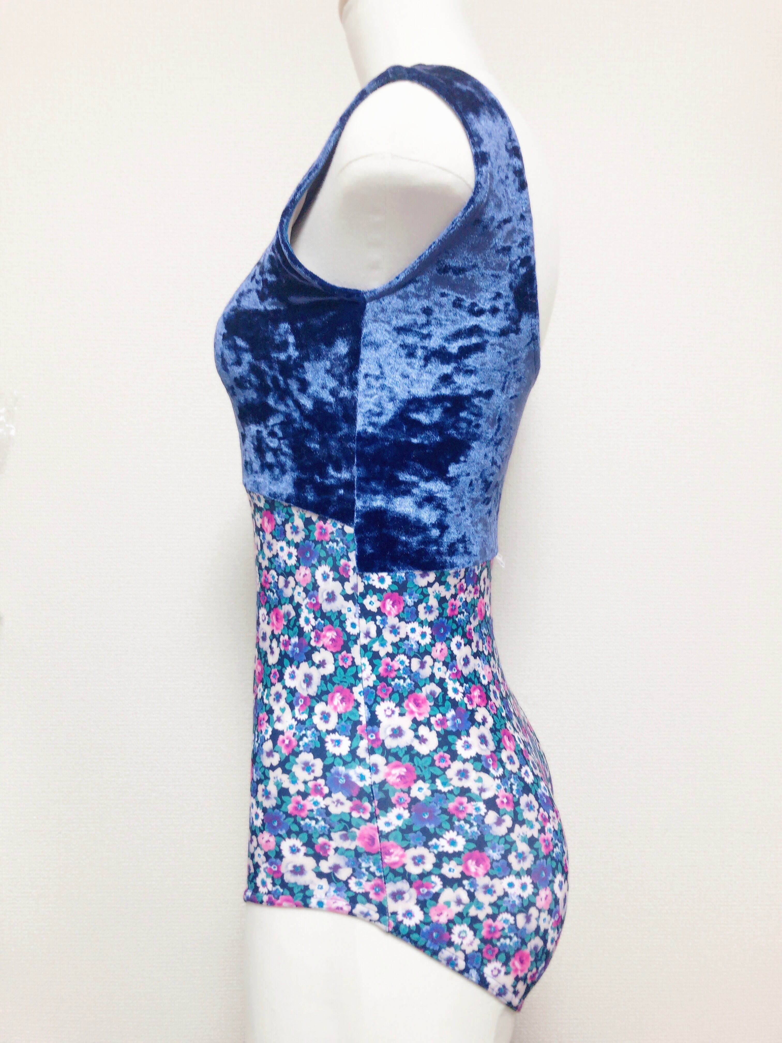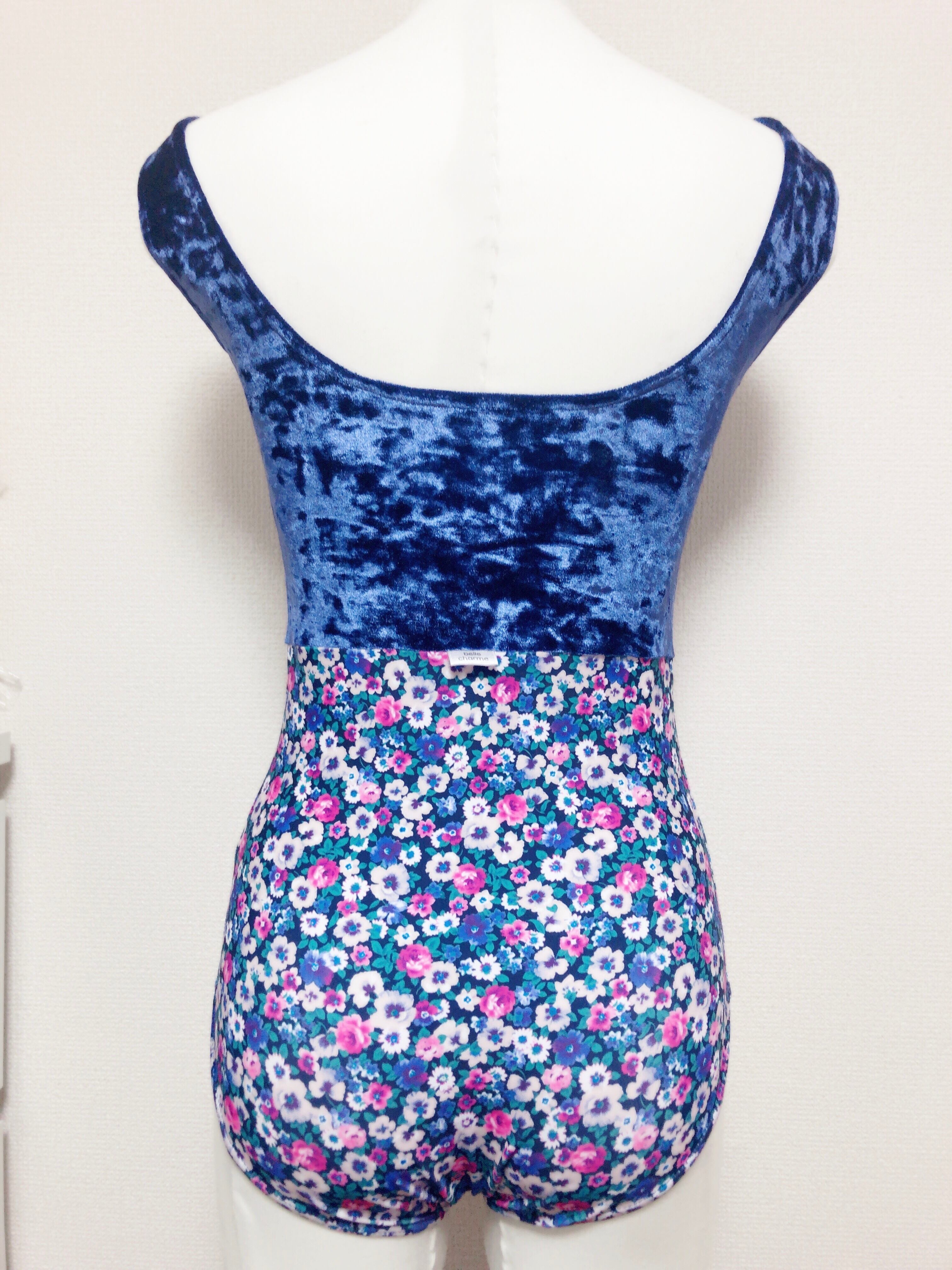 紺色のベルベット生地に小花柄の生地を合わせたレオタードです。