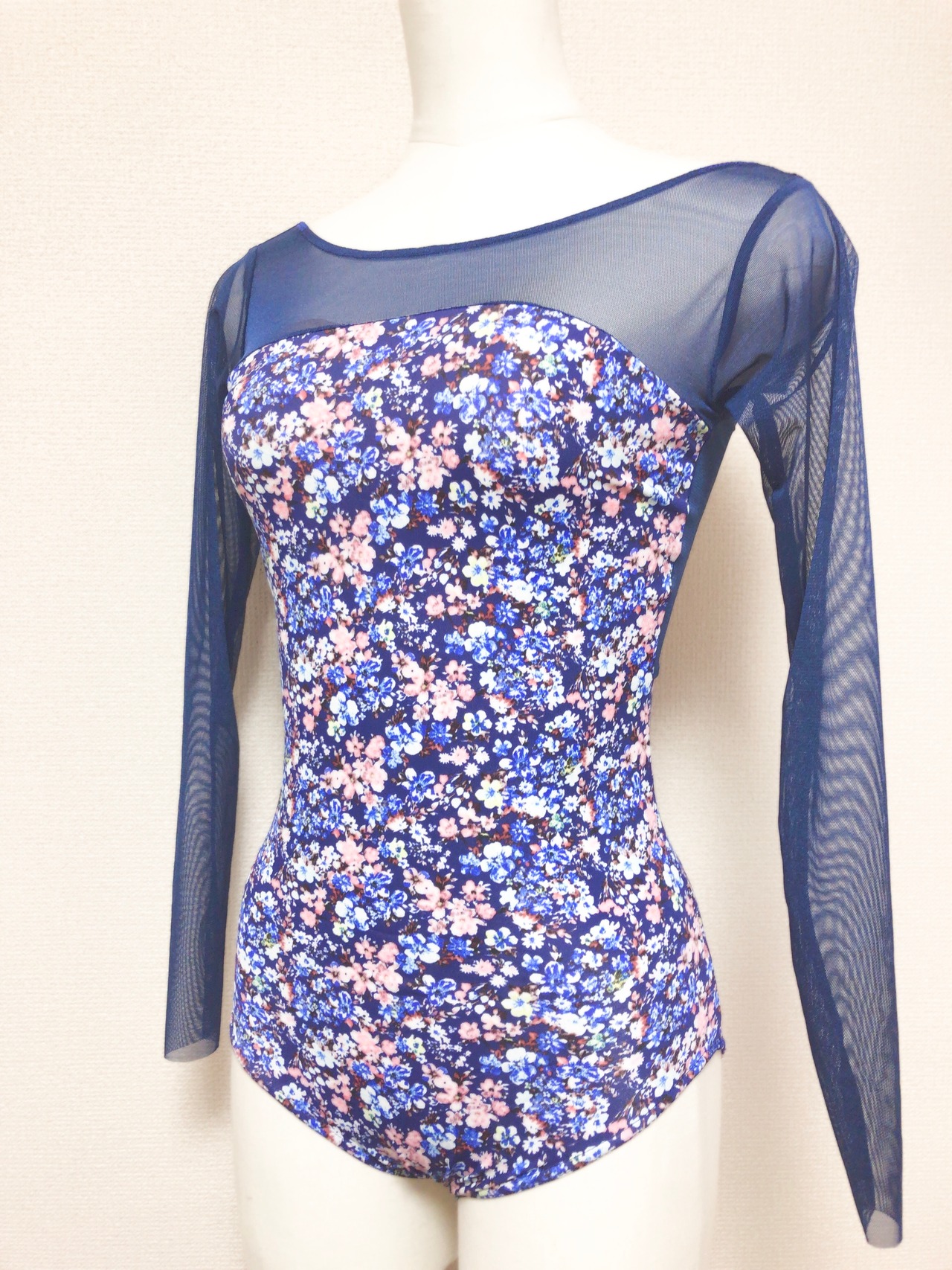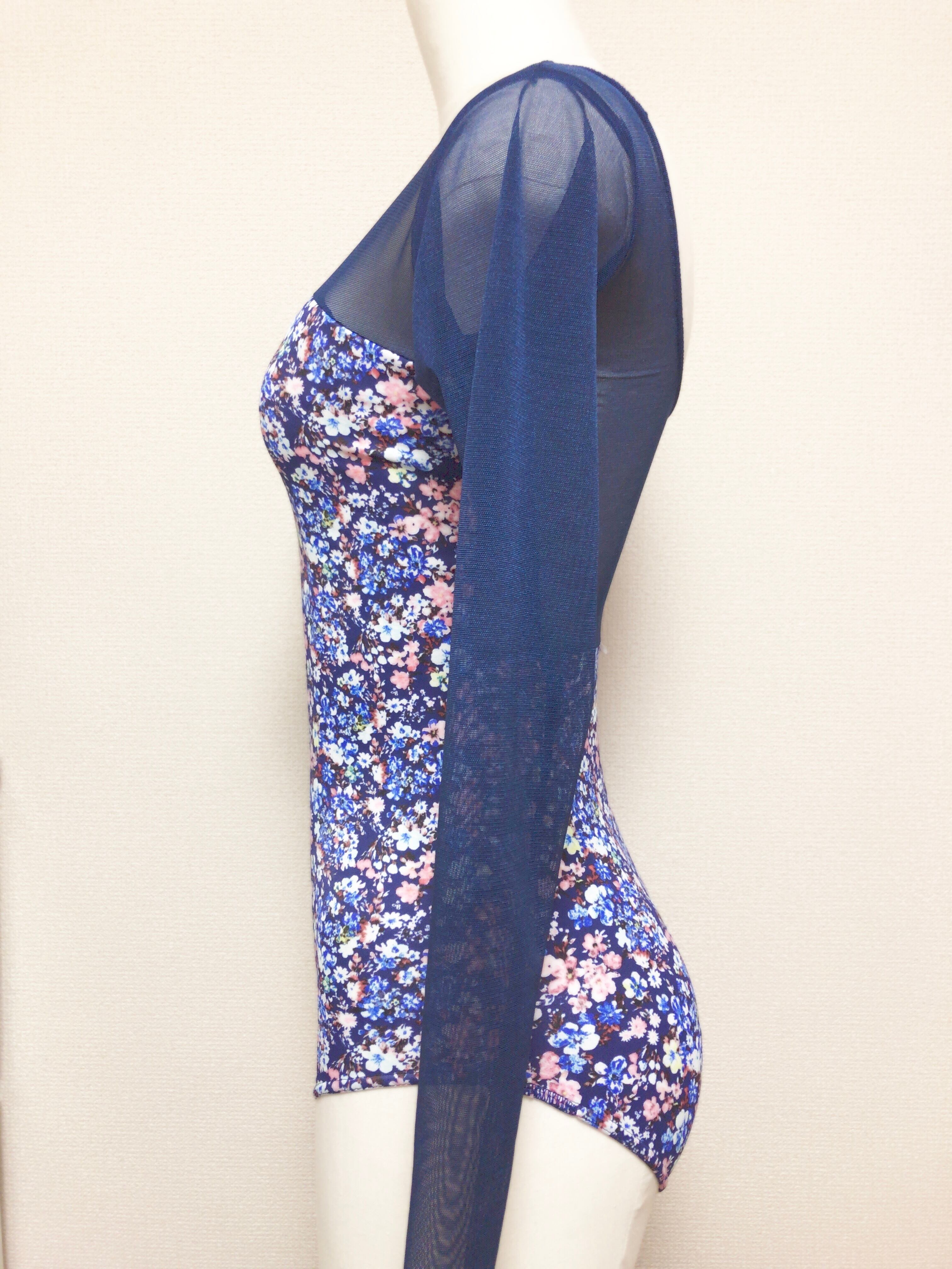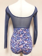 紺色ベースの小花柄の生地に紺色メッシュを組み合わせた長袖レオタードです。