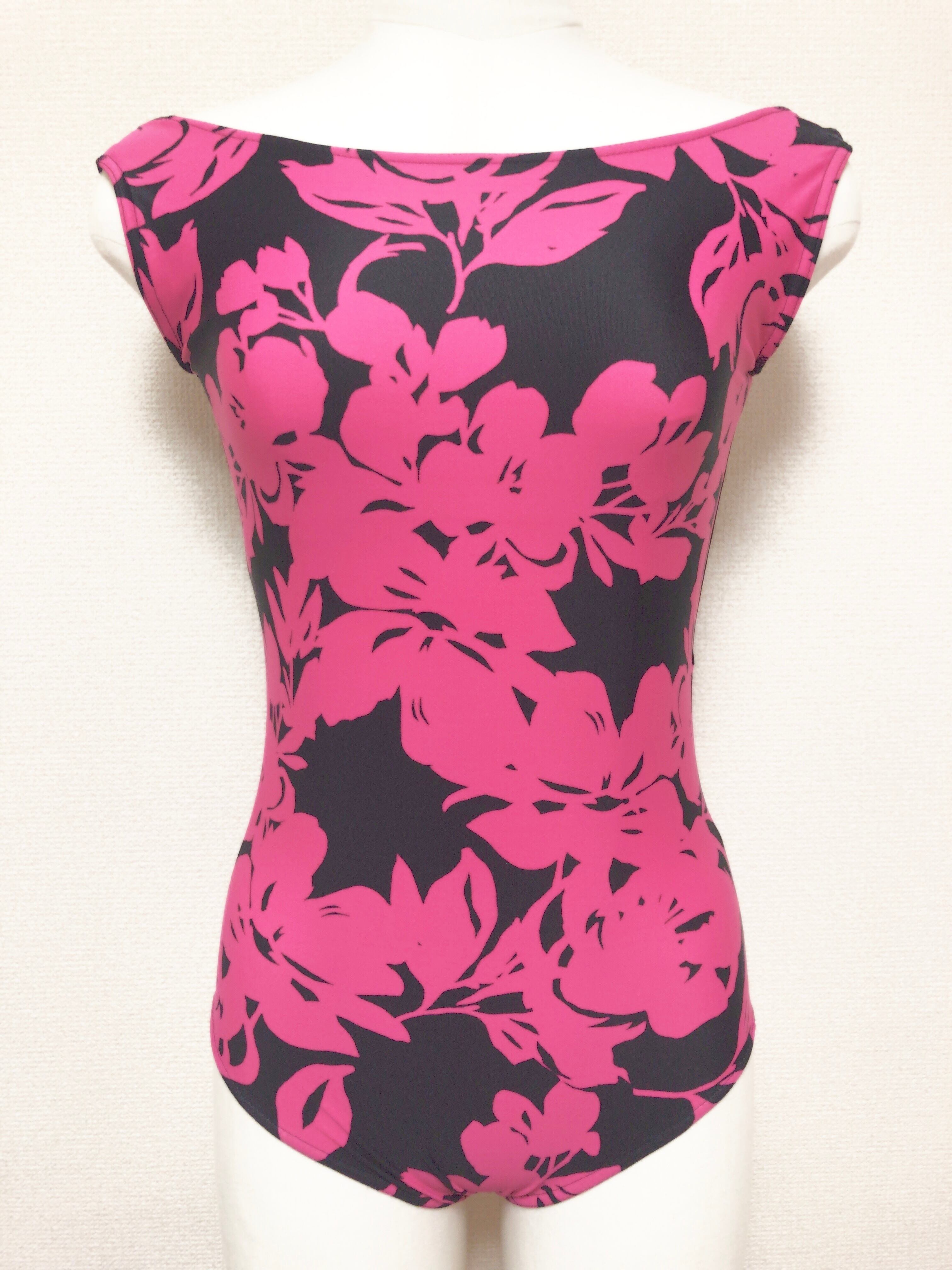 黒生地に大きなピンク色のお花模様の総柄タンクトップレオタードです。