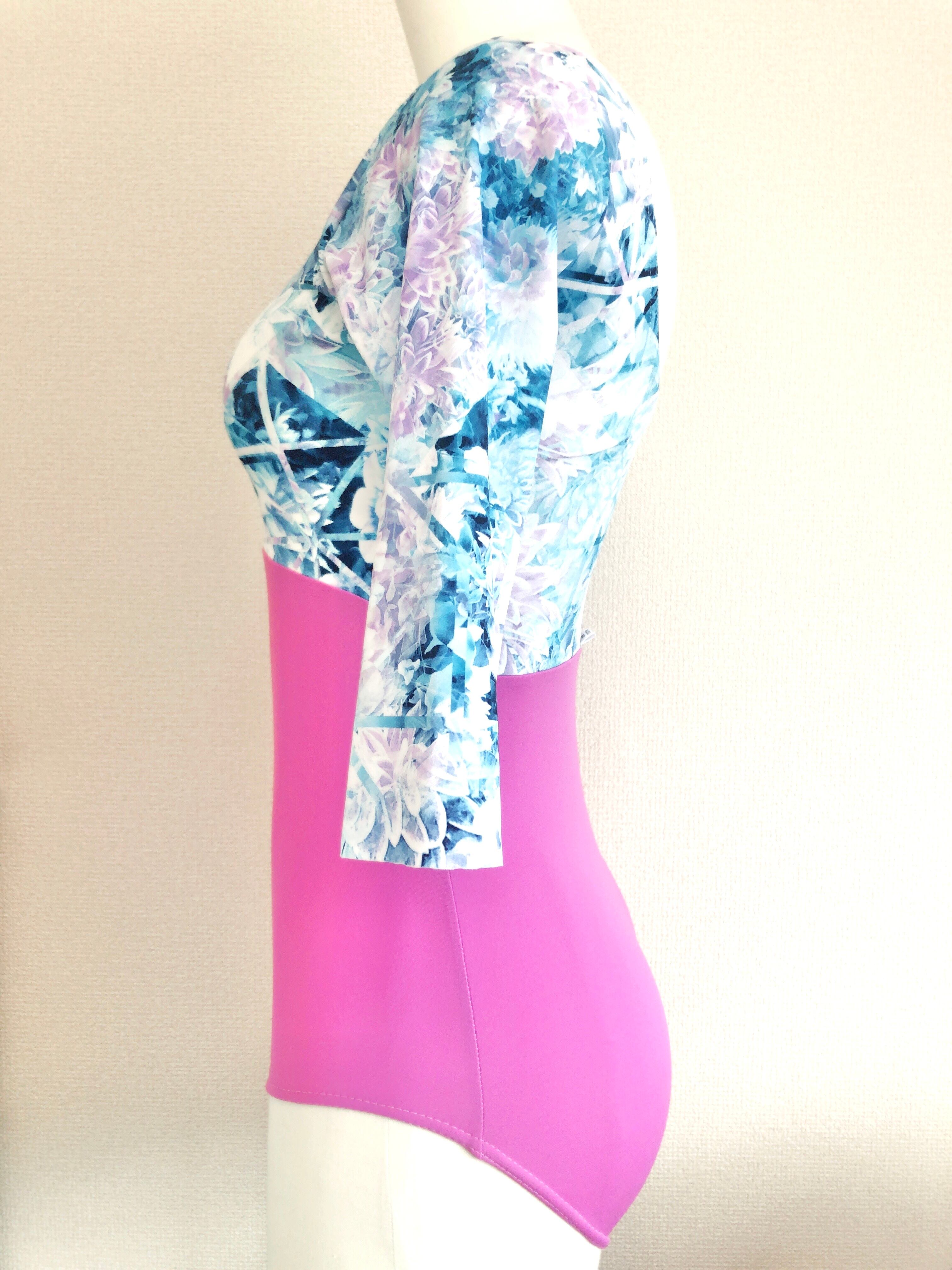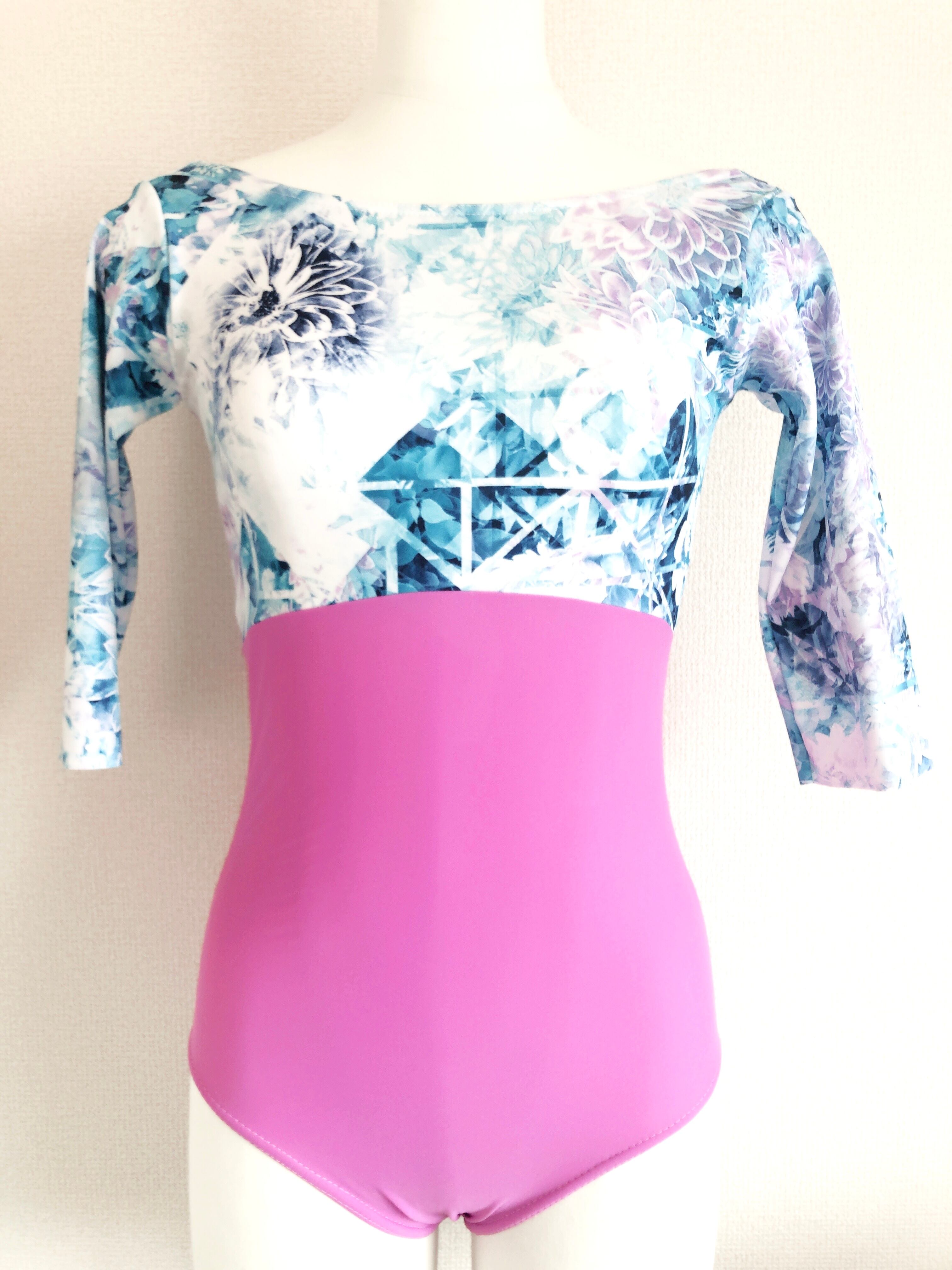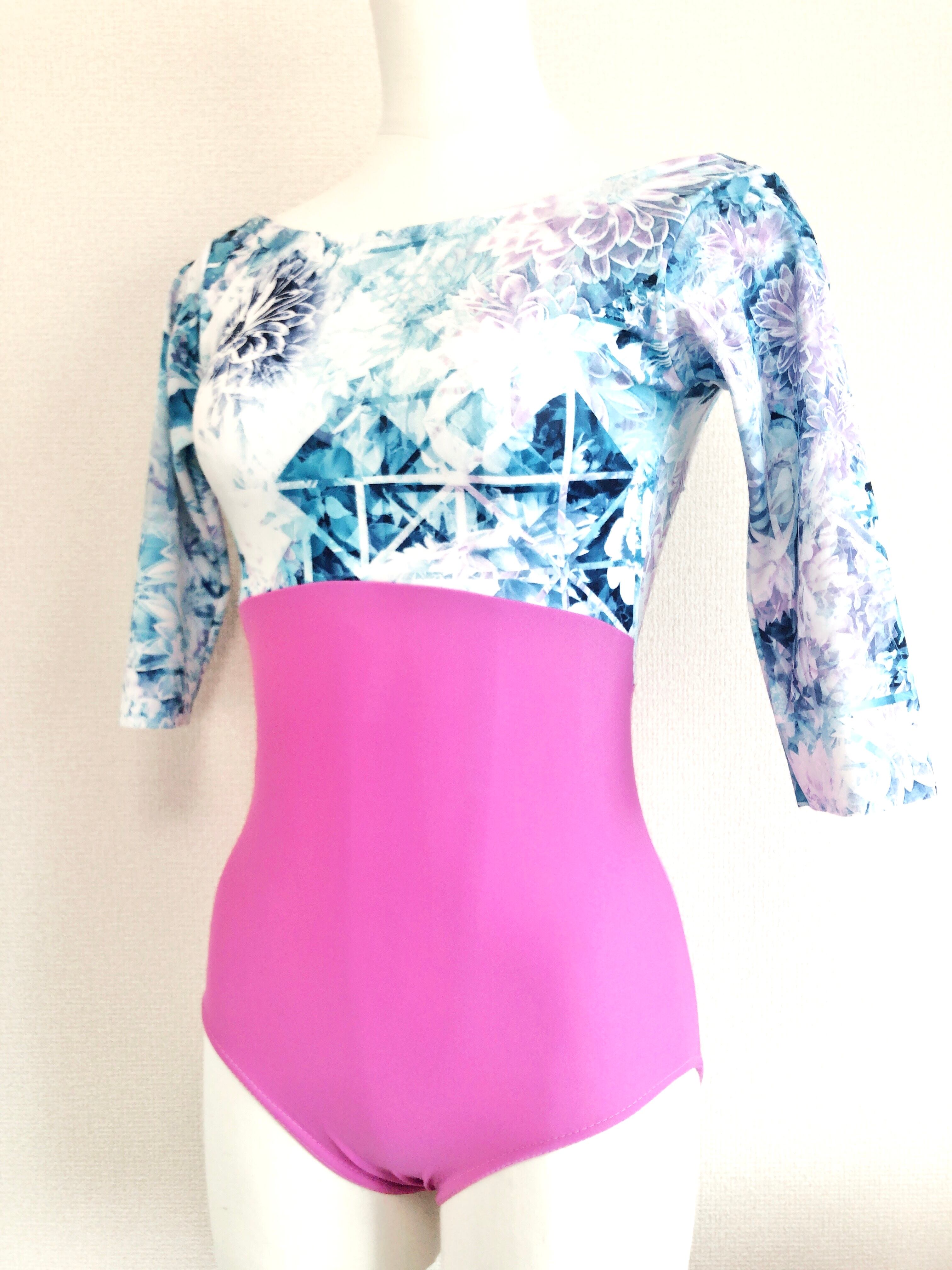 ステンドグラスの様な模様の生地に紫ピンクの生地を合わせた5部袖レオタードです。