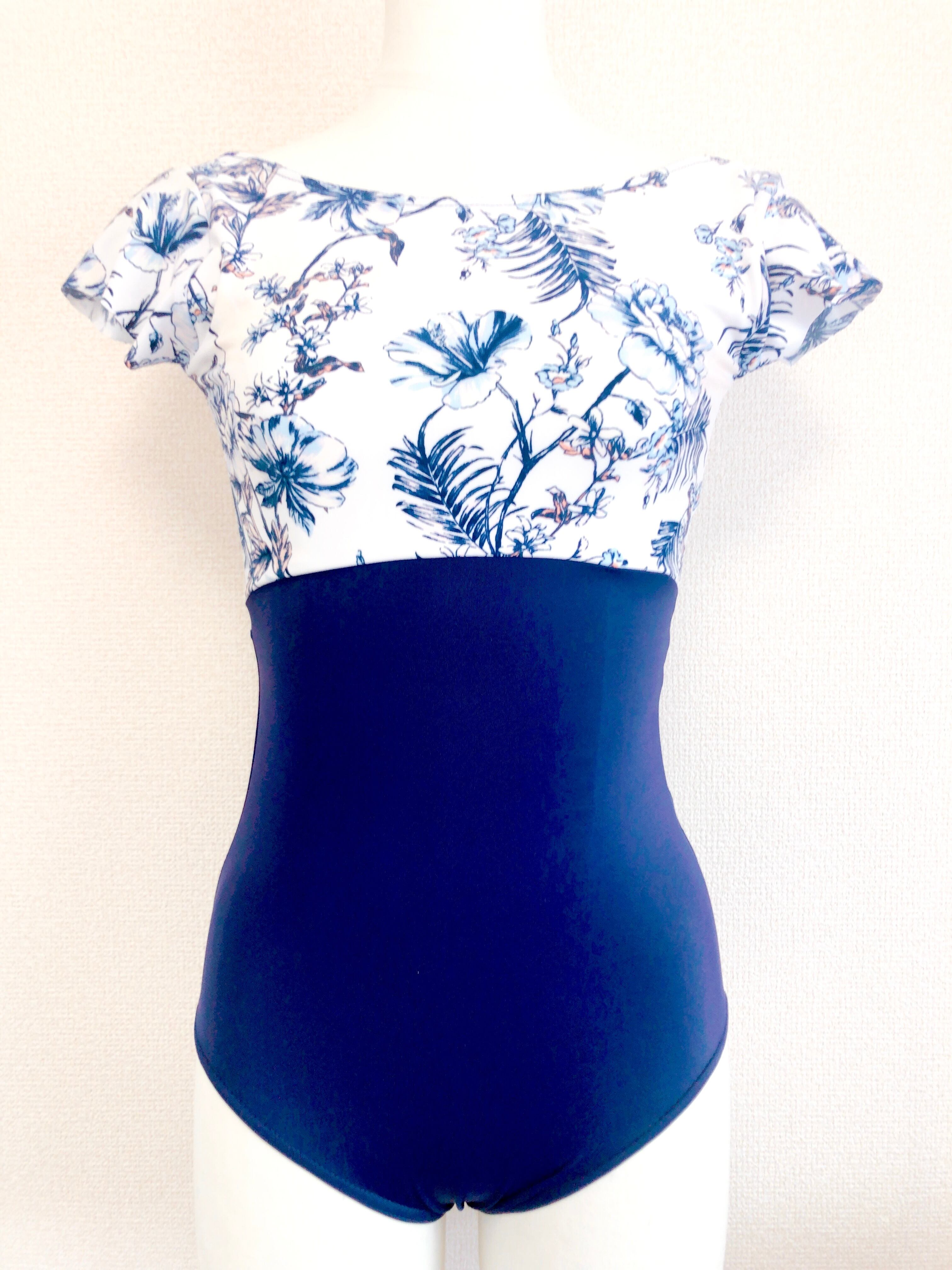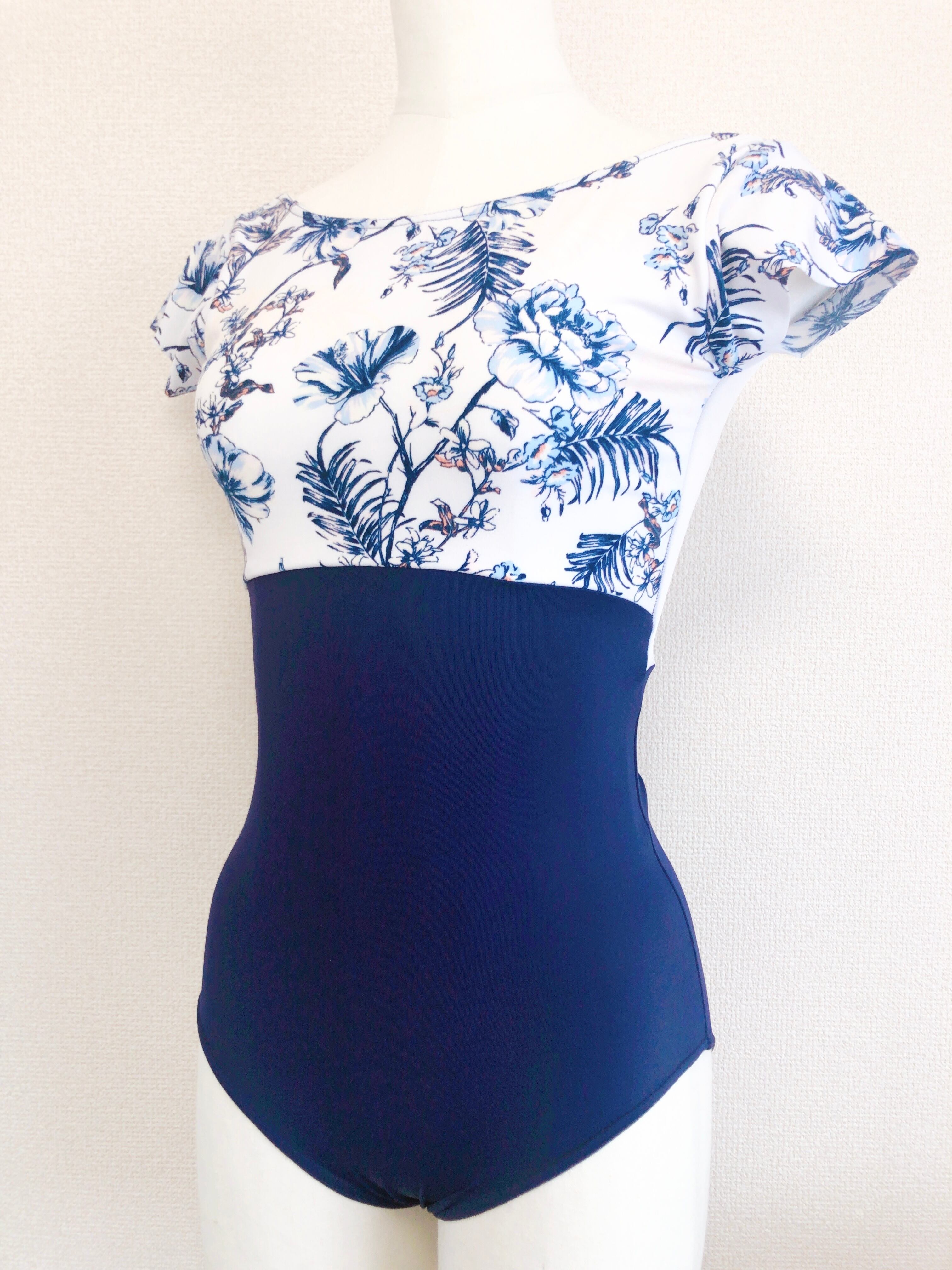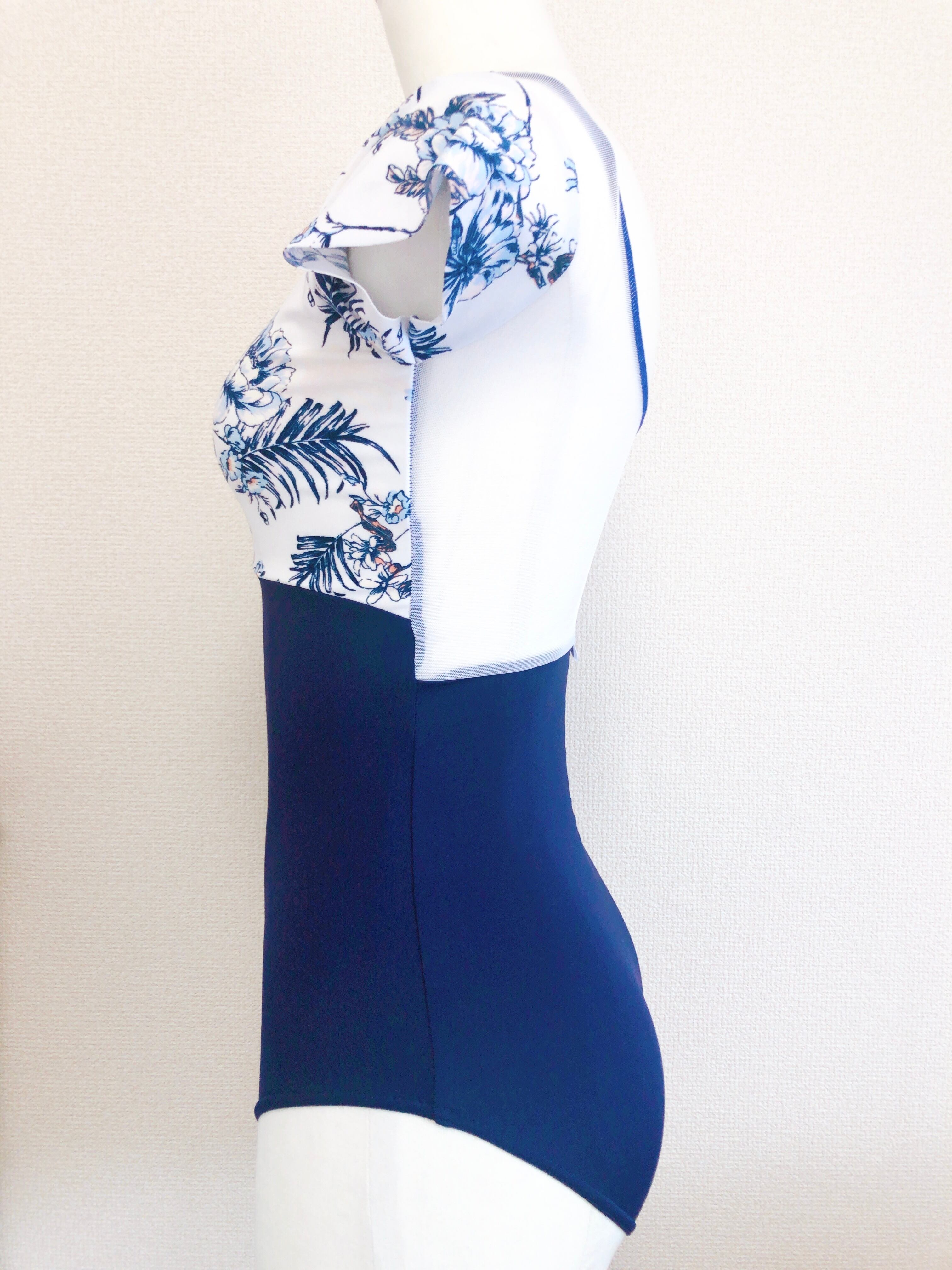 紺色の生地に白地に紺色のお花模様の生地を合わせた半袖レオタードです。