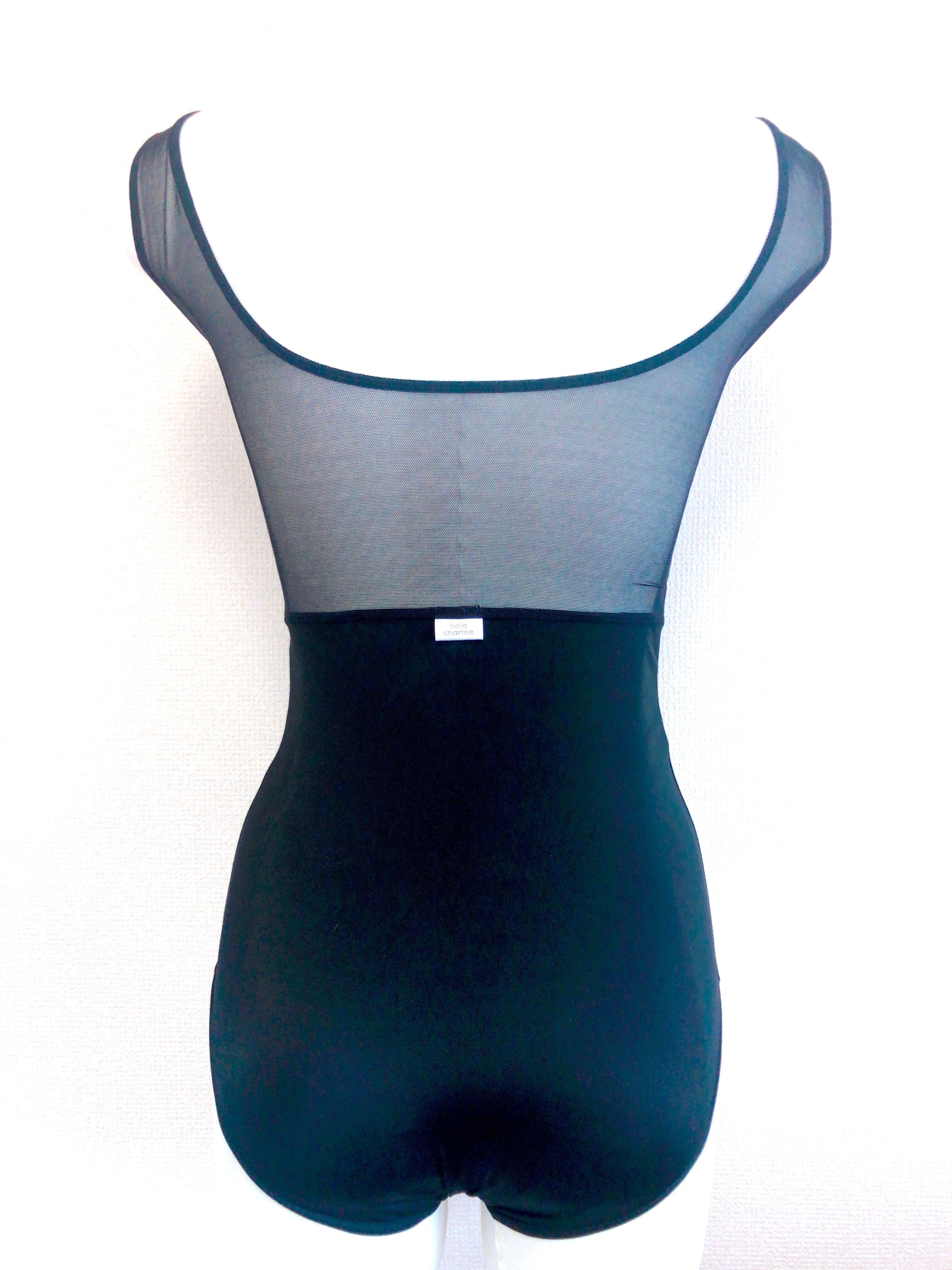 レース模様の生地に黒生地を合わせたタンクトップレオタードです。