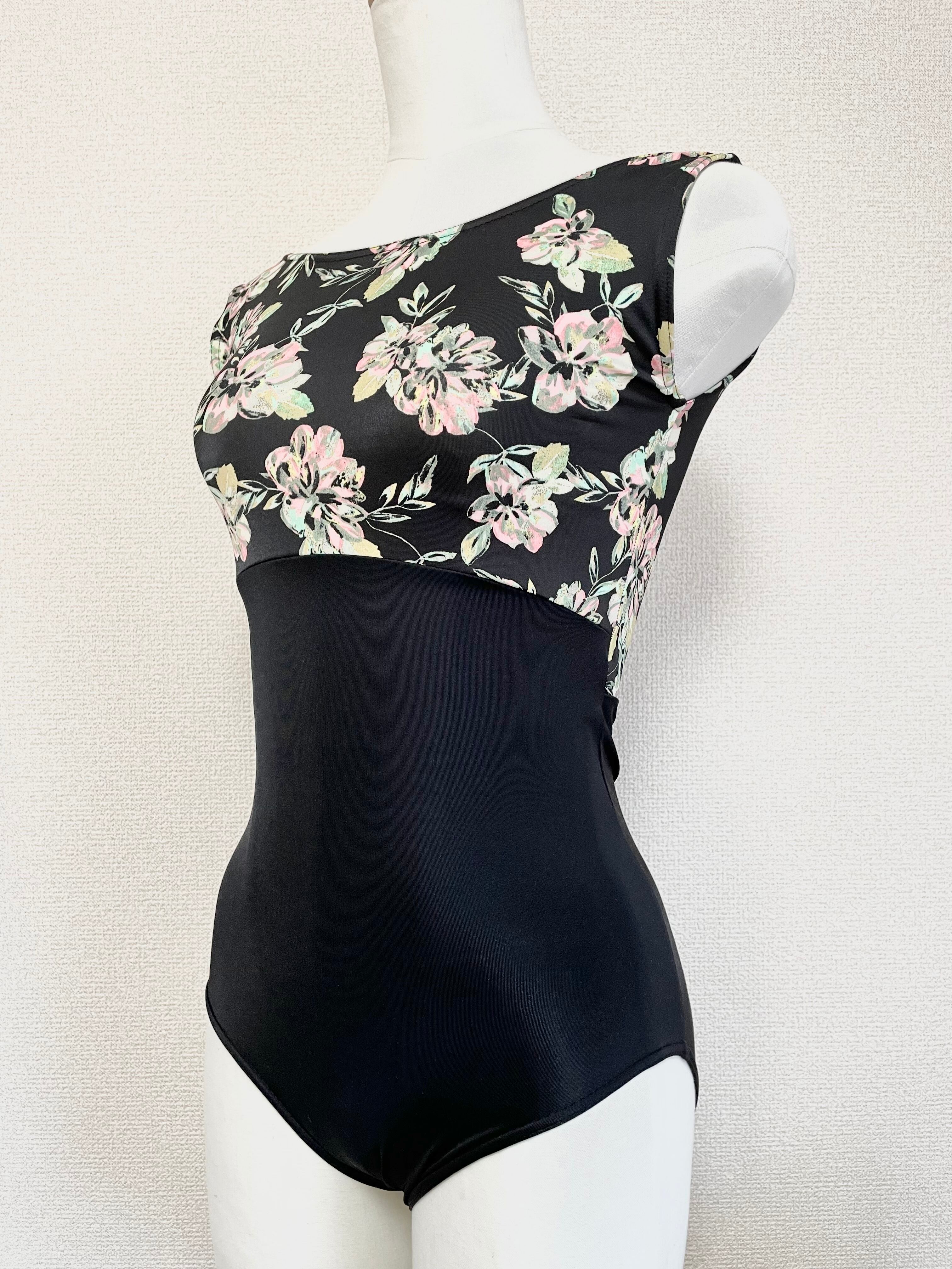 黒生地のボディに黒ベースの花柄の生地を合わせた大人っぽいデザインとレオタードです。
