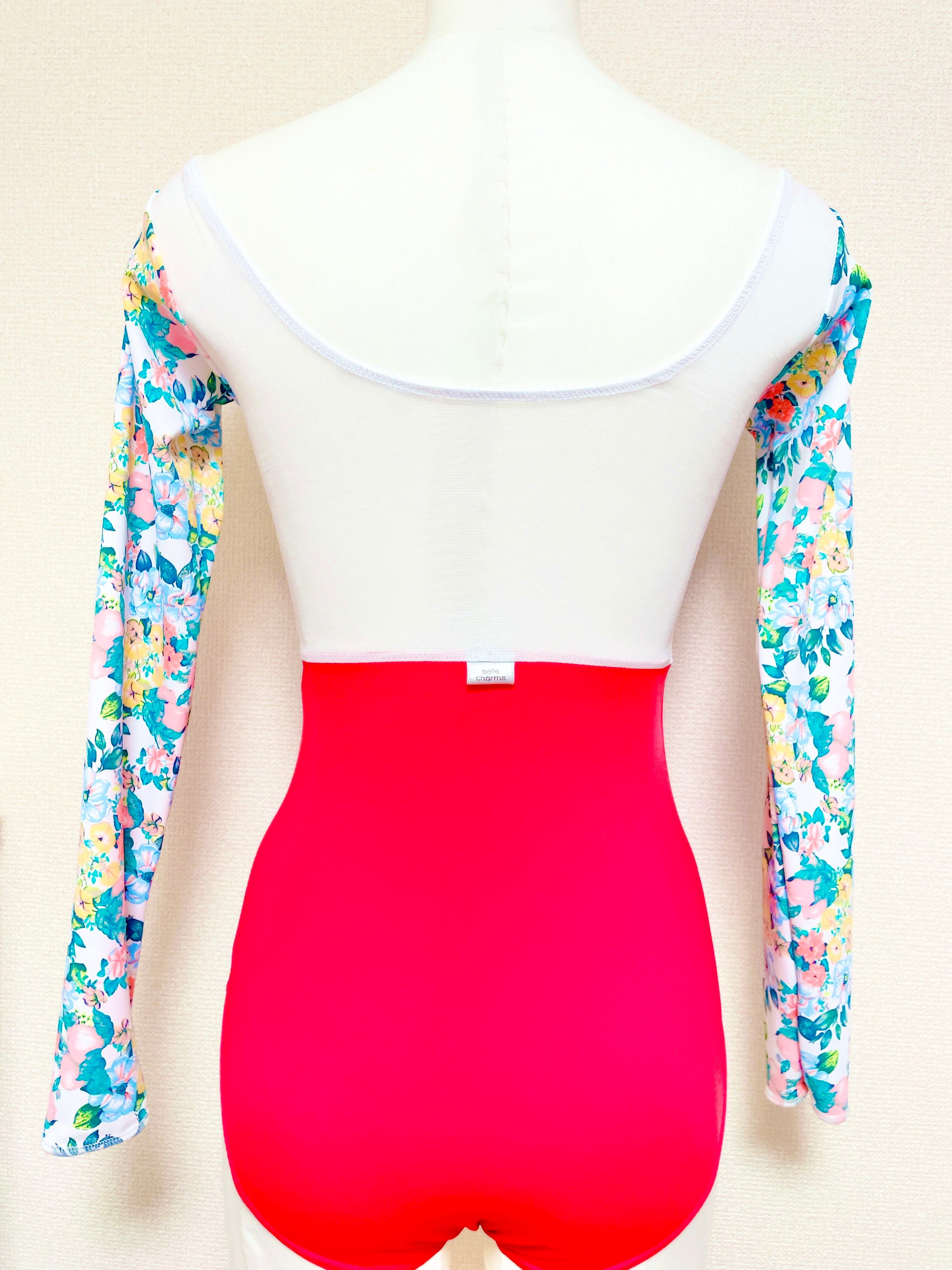 お花畑のような柄生地に赤色のボディを合わせた長袖レオタードです。