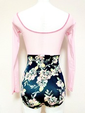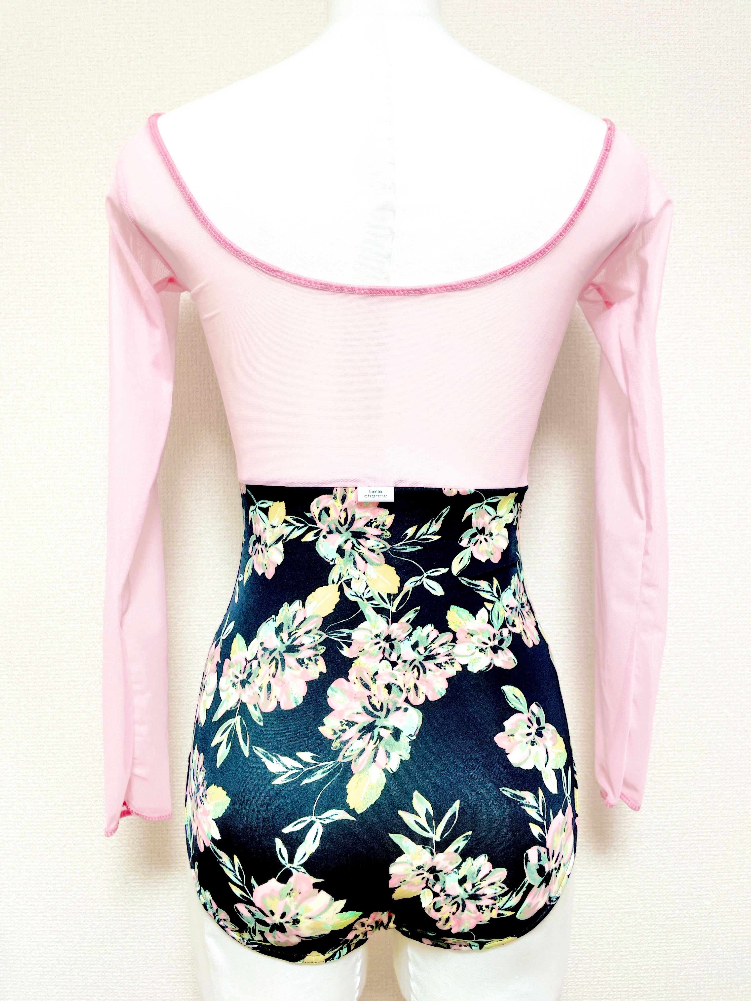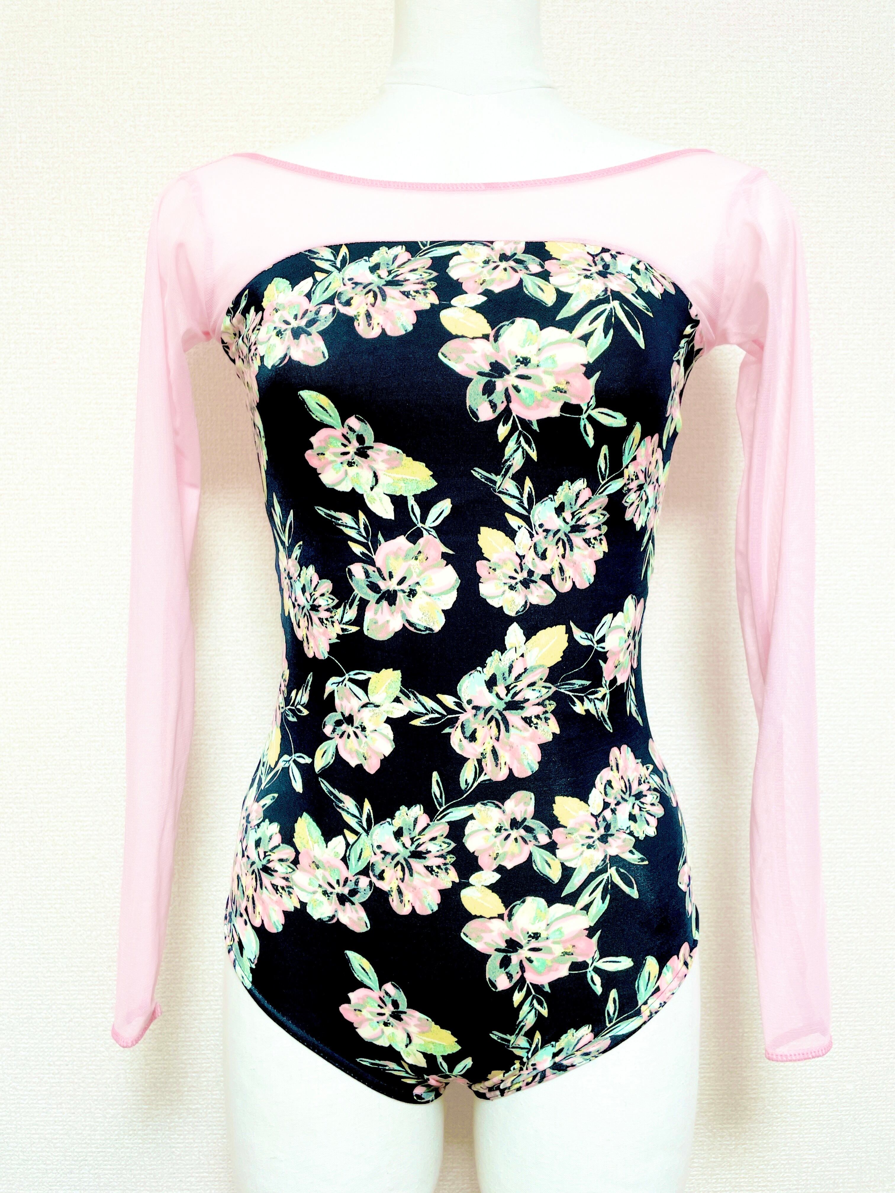 黒地にcolorfulなお花が描かれた生地に薄ピンクのメッシュ生地を合わせました。