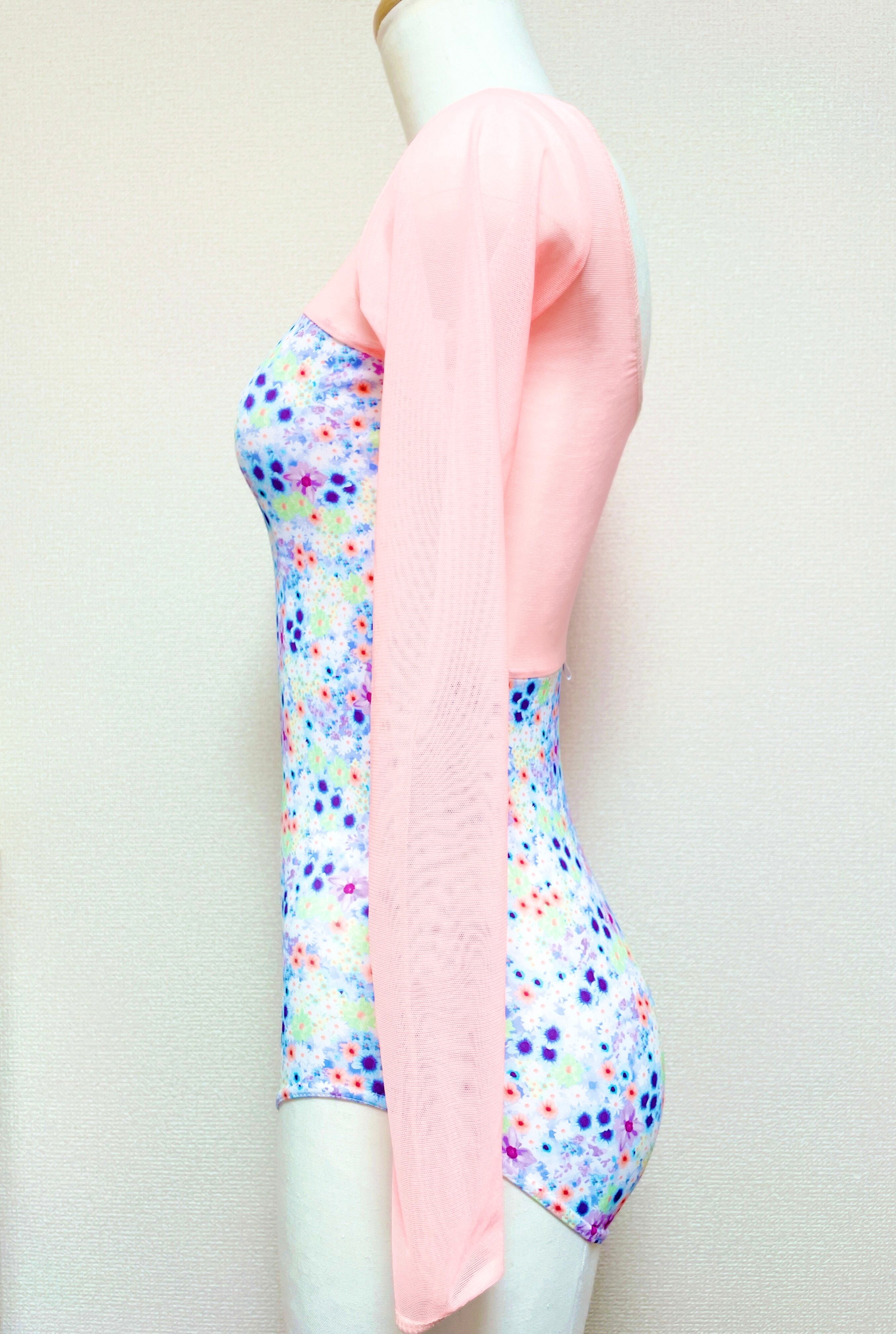 パステルの小花柄にサーモンピンクのメッシュ生地を合わせました。