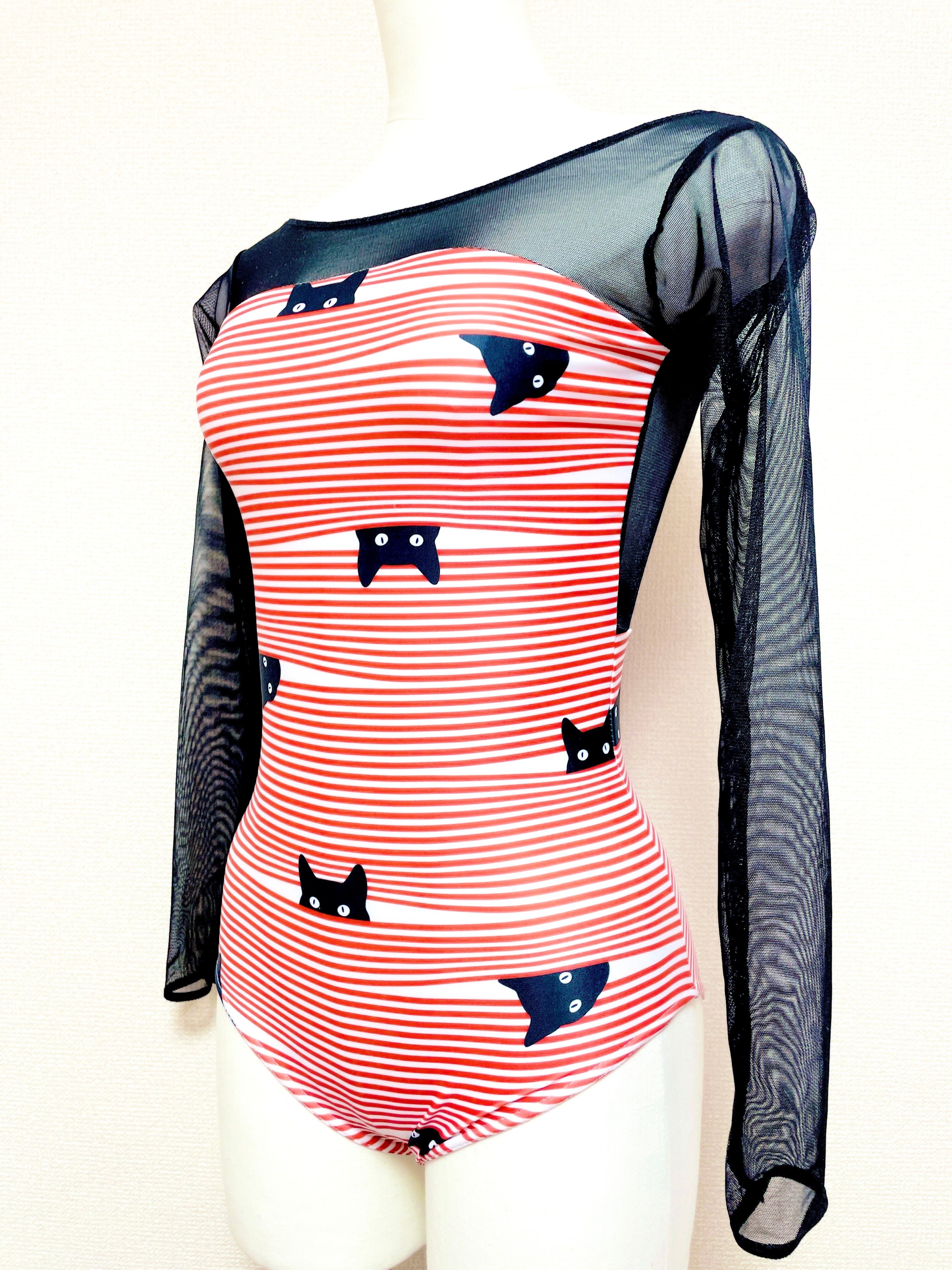 赤ボーダーに黒猫が覗いている生地に黒メッシュを合わせました。