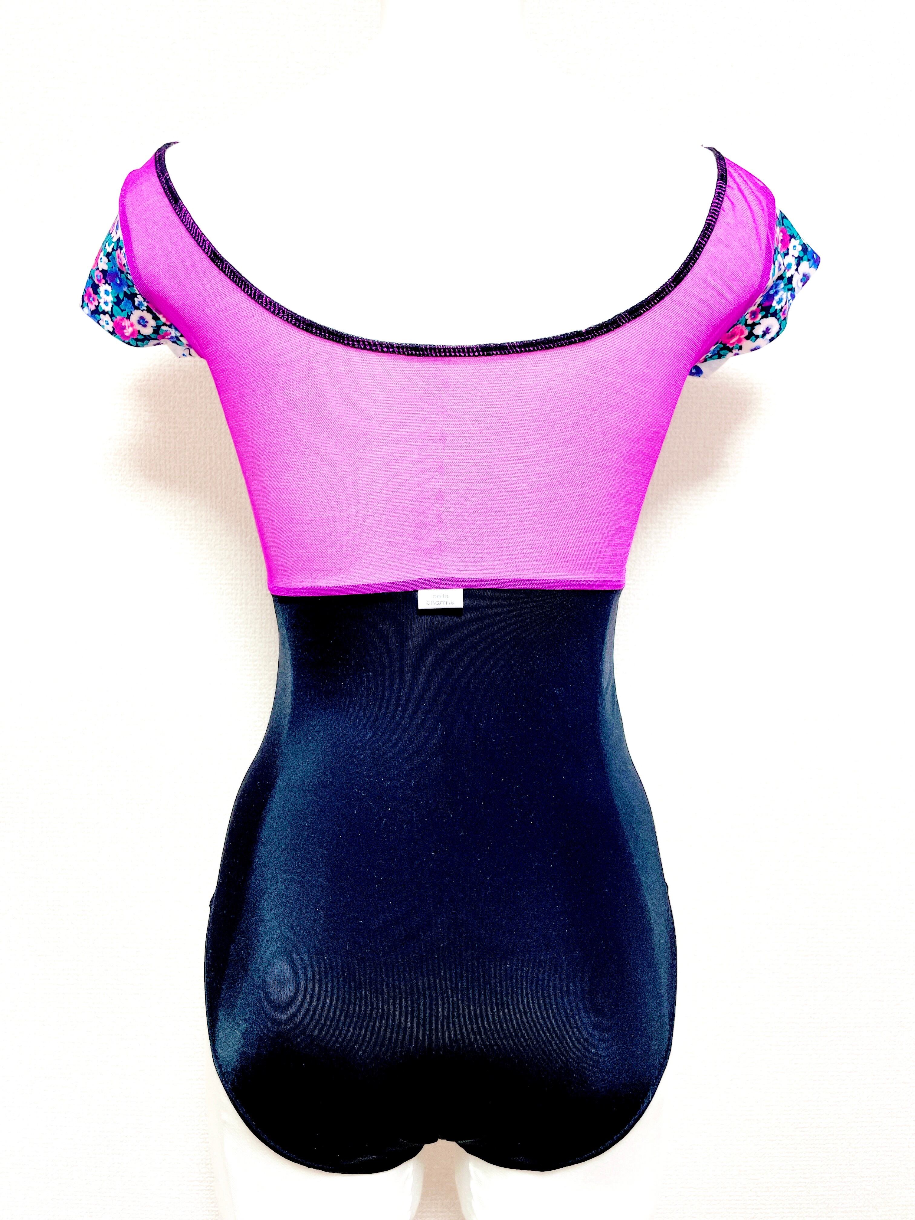 小花柄の生地に黒ボディ、背中はビビットピンクのメッシュ生地を合わせました。