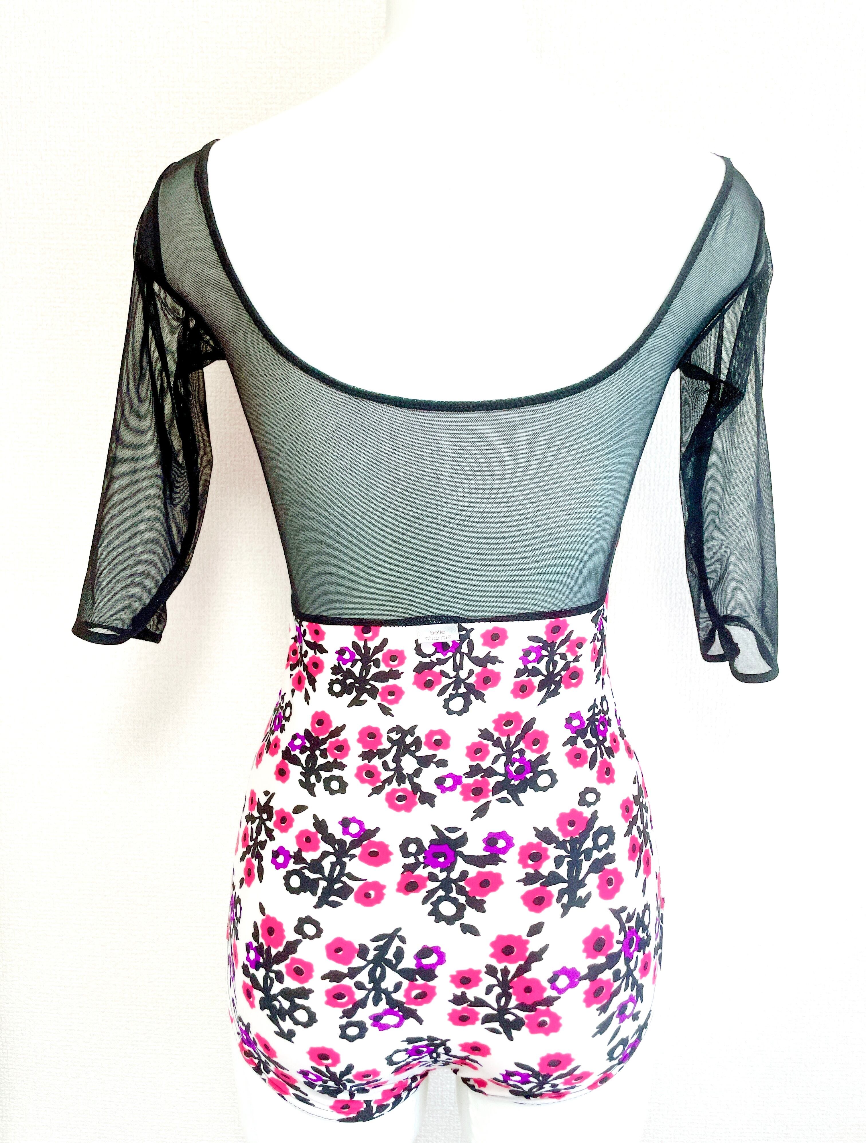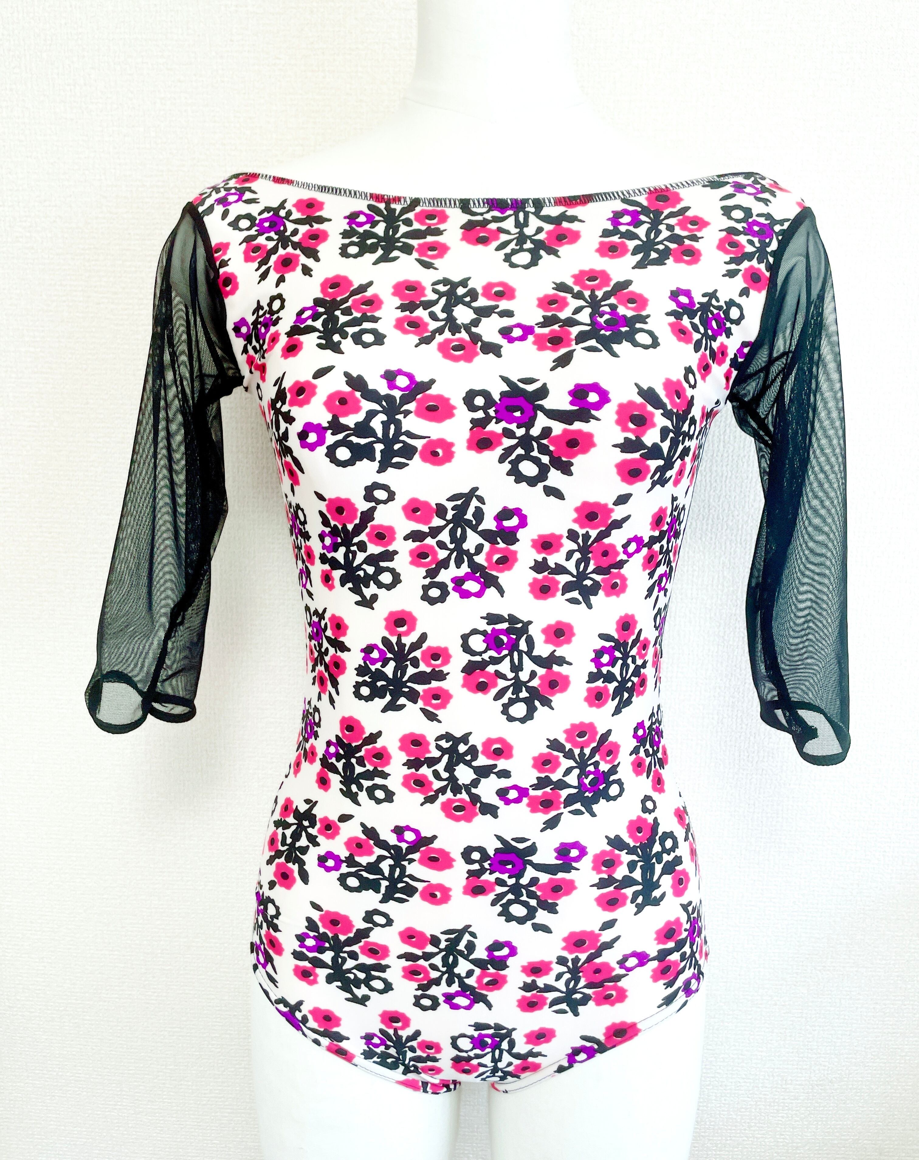 花束模様の総柄に黒メッシュを合わせた5部袖レオタードです。