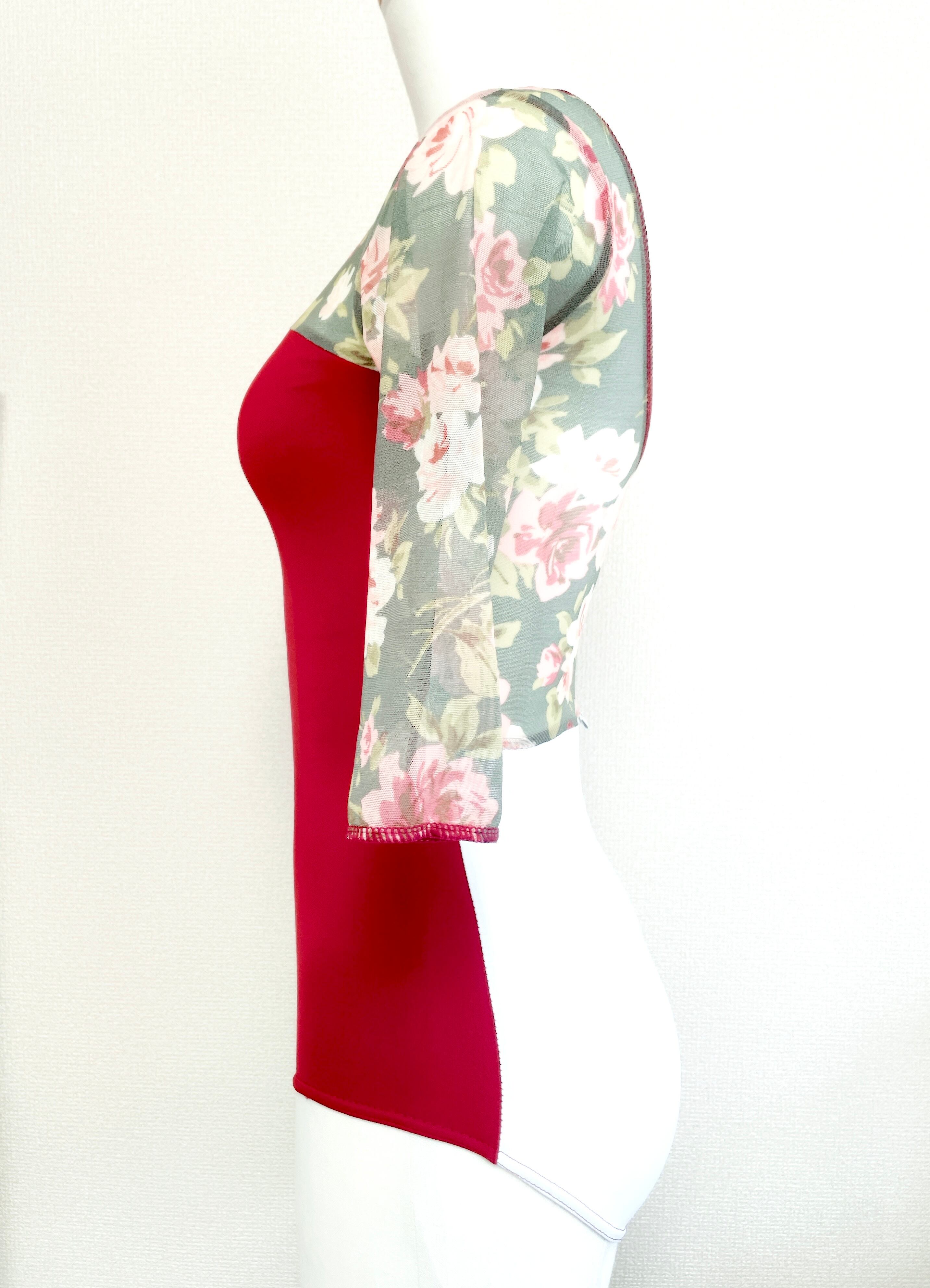 ボディにボルドー、バックに白を使い花柄のメッシュ生地を合わせて5部袖レオタードです。